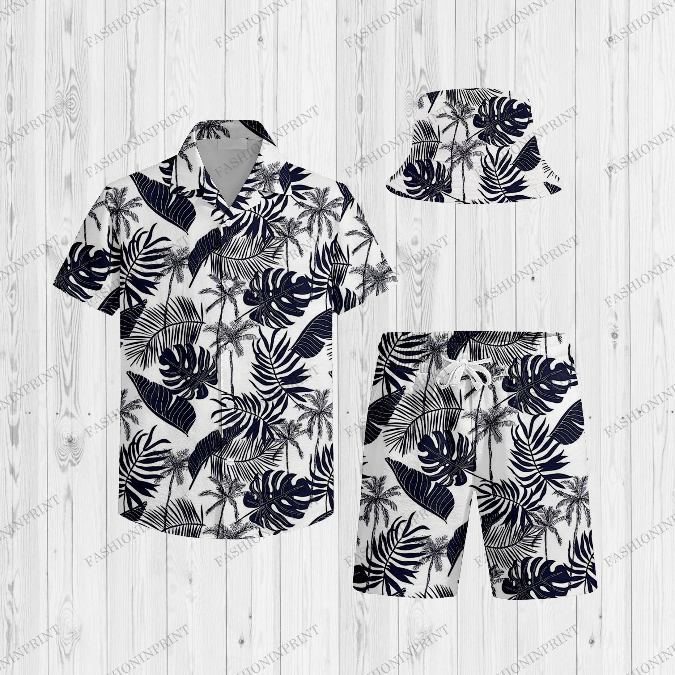 3Pcs Men's Black & White Hawaiian Printed Short Sleeves Shirt & Short & Fisherman's Hat