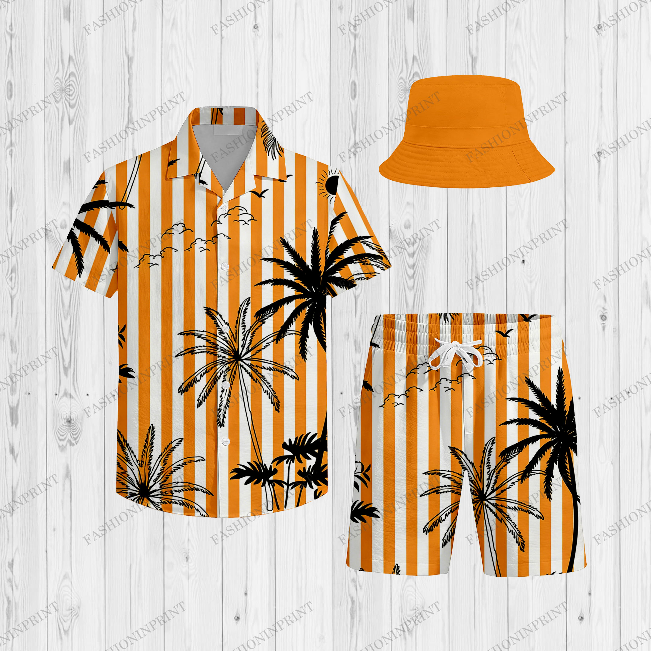 3Pcs Men's Yellow & White Color Matching Striped Hawaiian Printed Short Sleeves Shirt & Short & Fisherman's Hat