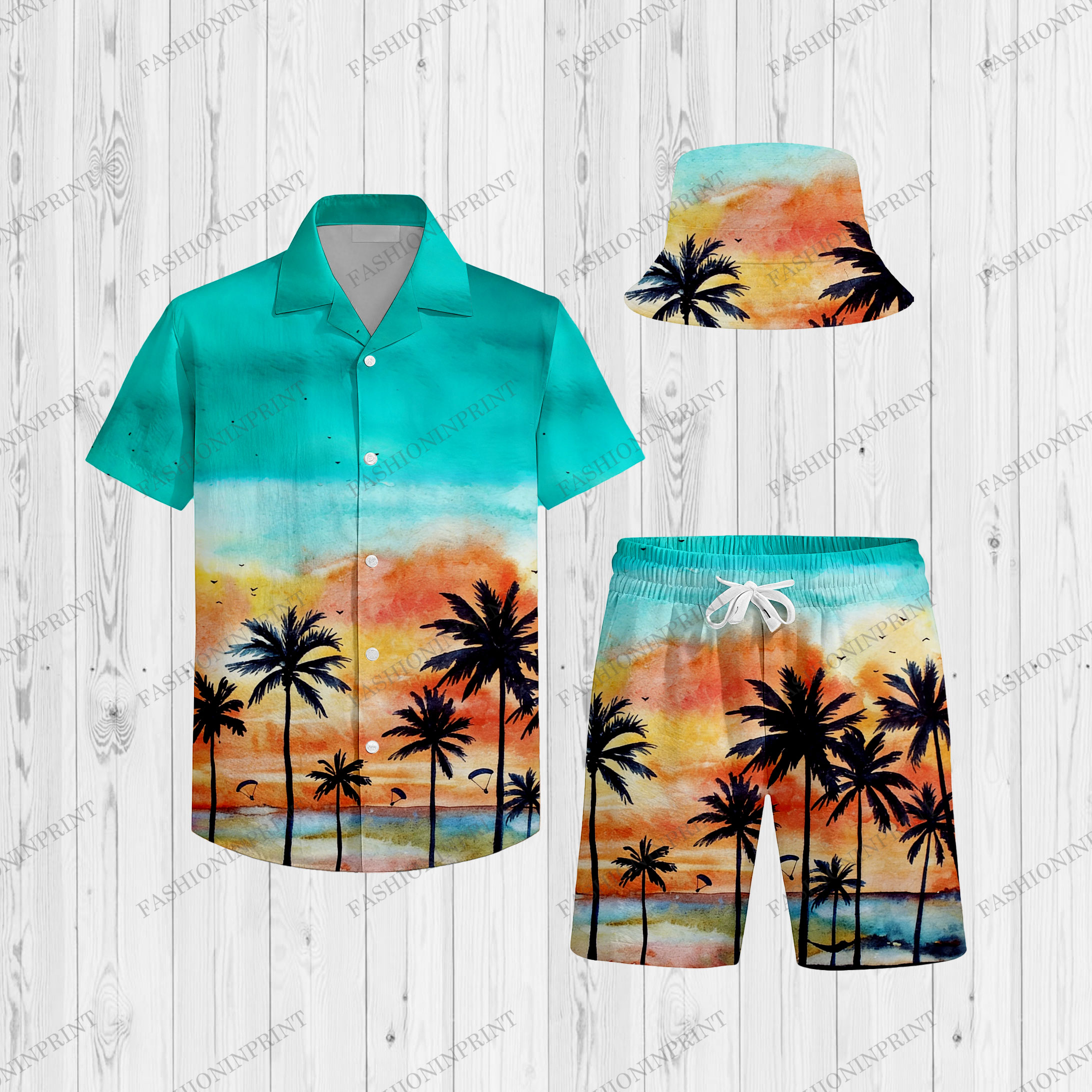 3Pcs Men's Lake Green & Beach Hawaiian Printed Short Sleeves Shirt & Short & Fisherman's Hat