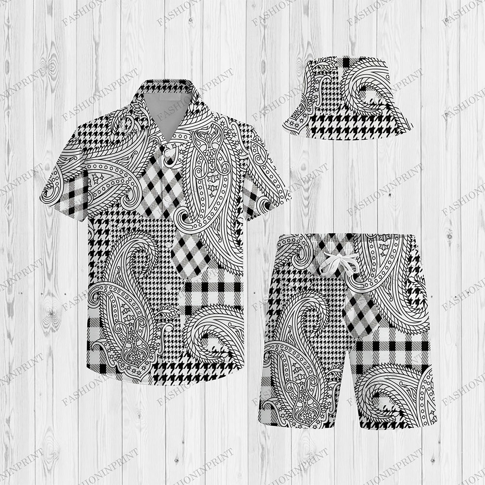 3Pcs Men's Black & White Retro Style Printed Short Sleeves Shirt & Short & Fisherman's Hat