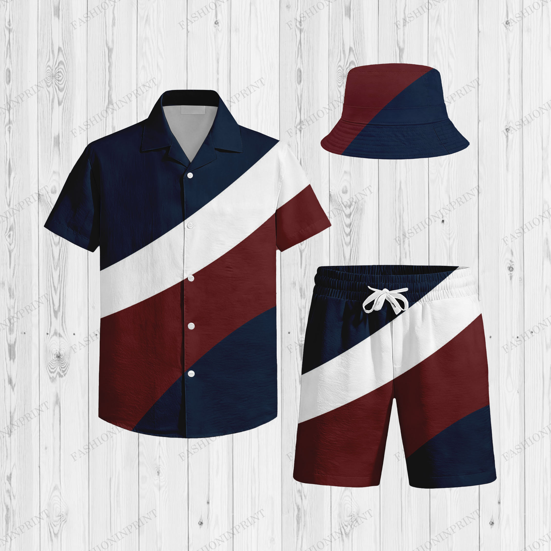 3Pcs Men's Maroon & White & Navy Blue Color Matching Printed Short Sleeves Shirt & Short & Fisherman's Hat