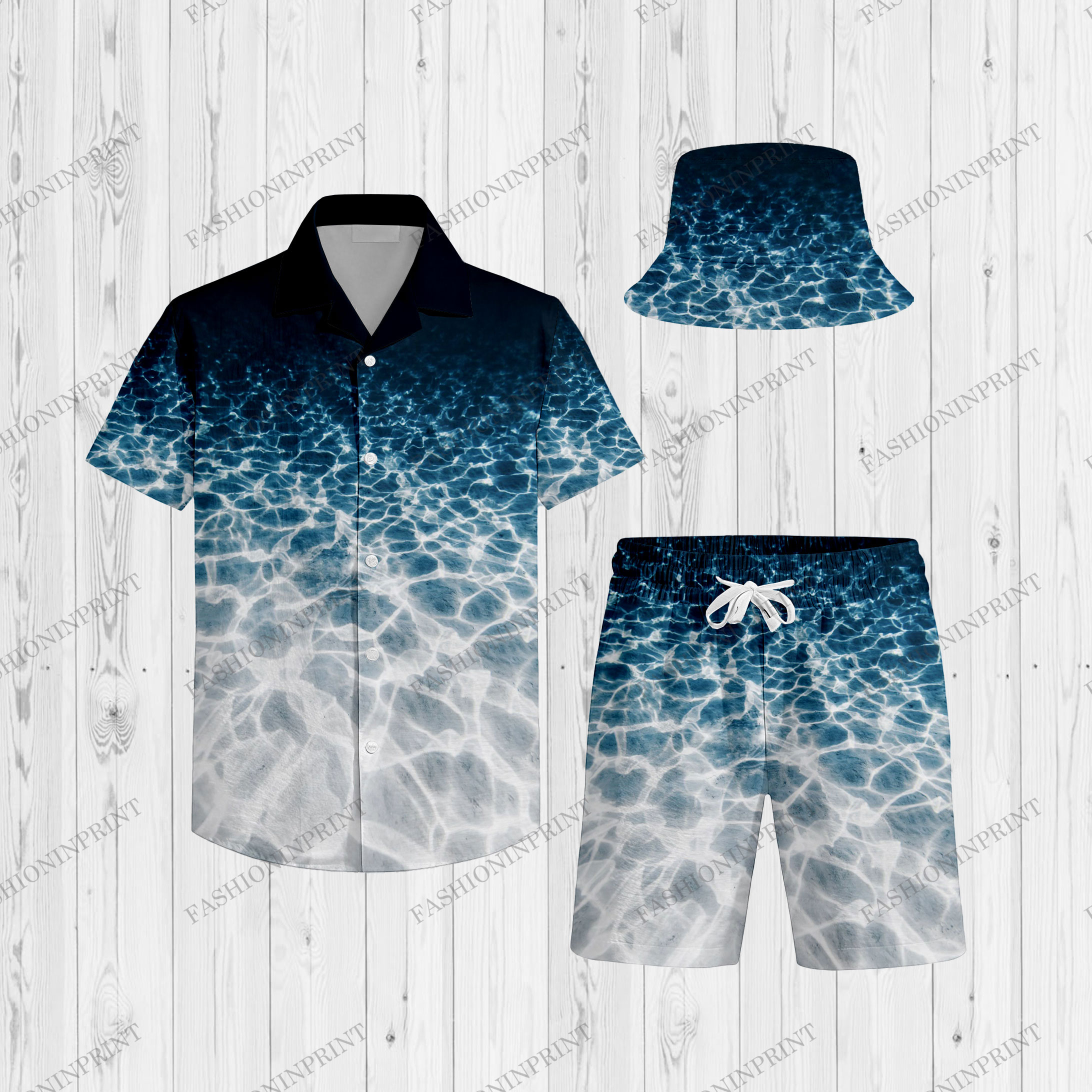 3Pcs Men's Navy Blue Sea Gradient Hawaiian Printed Short Sleeves Shirt & Short & Fisherman's Hat