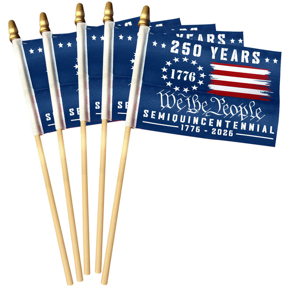 PREMIUM MATERIAL: The American Flag with stick is made of high quality Canvas and printed on Two sides. Tear-resistant and waterproof, even in strong winds, not easy to fade, full-color printing process, bright and authentic colours. In addition, the small American flag on stick is already fixed on the flagpole, so you don't need to worry about the flag slipping down during waving. The American hand waved flag is equipped with safer spear top, it doesn't have dangerous sharp corners to ensure safety during use.