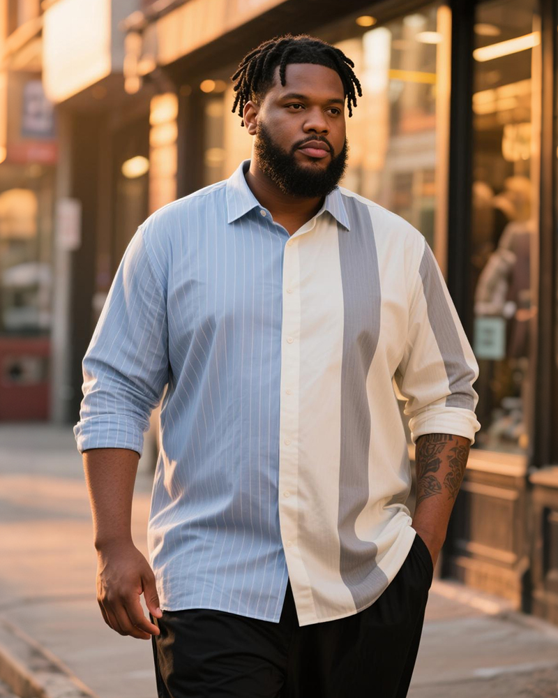 Big & Tall Men's Business Blue And White Contrast Vertical Stripe Printed Long Sleeve Shirt