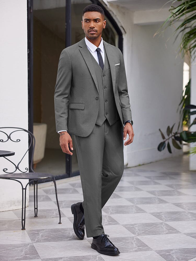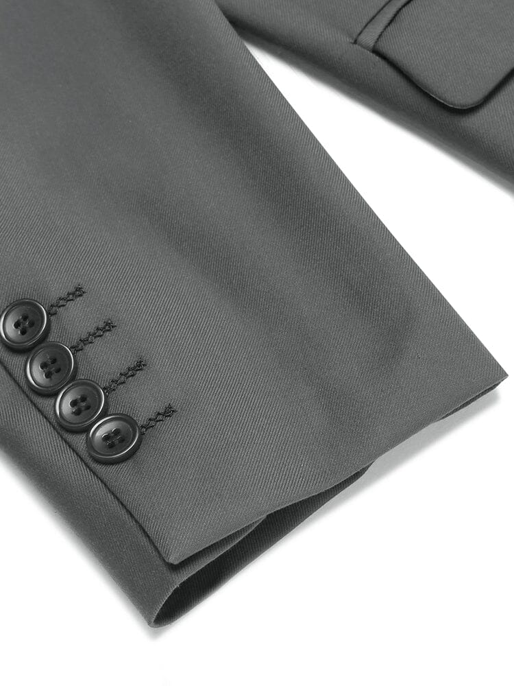 • Details: Blazer features one-button closure, a chest pocket and two front pockets; suit pant with slanted side pockets; vest with two front pockets and one chest pocket.