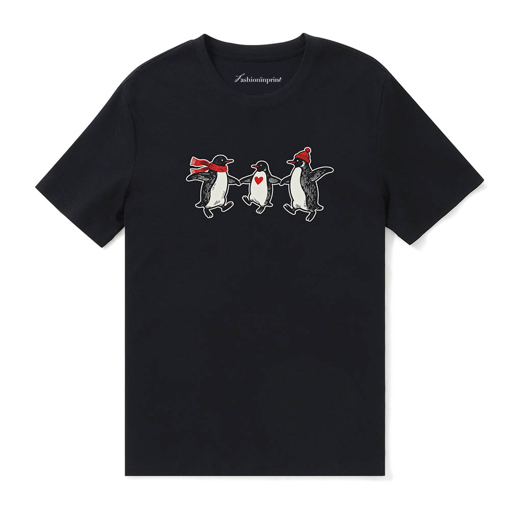 Three penguins in red scarves and knit hats dance joyfully hand in hand, spreading Christmas warmth and energy on a black background. Embrace the joy of holiday reunions and winter whimsy in this street-style shirt.