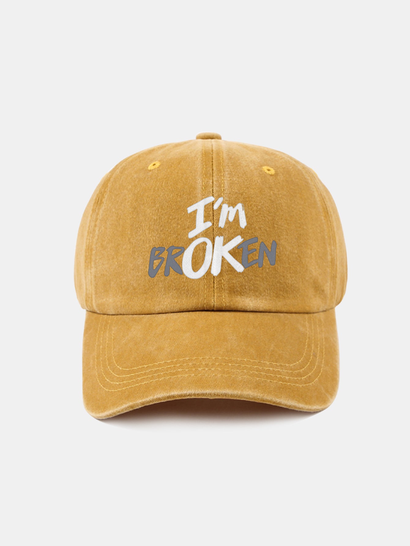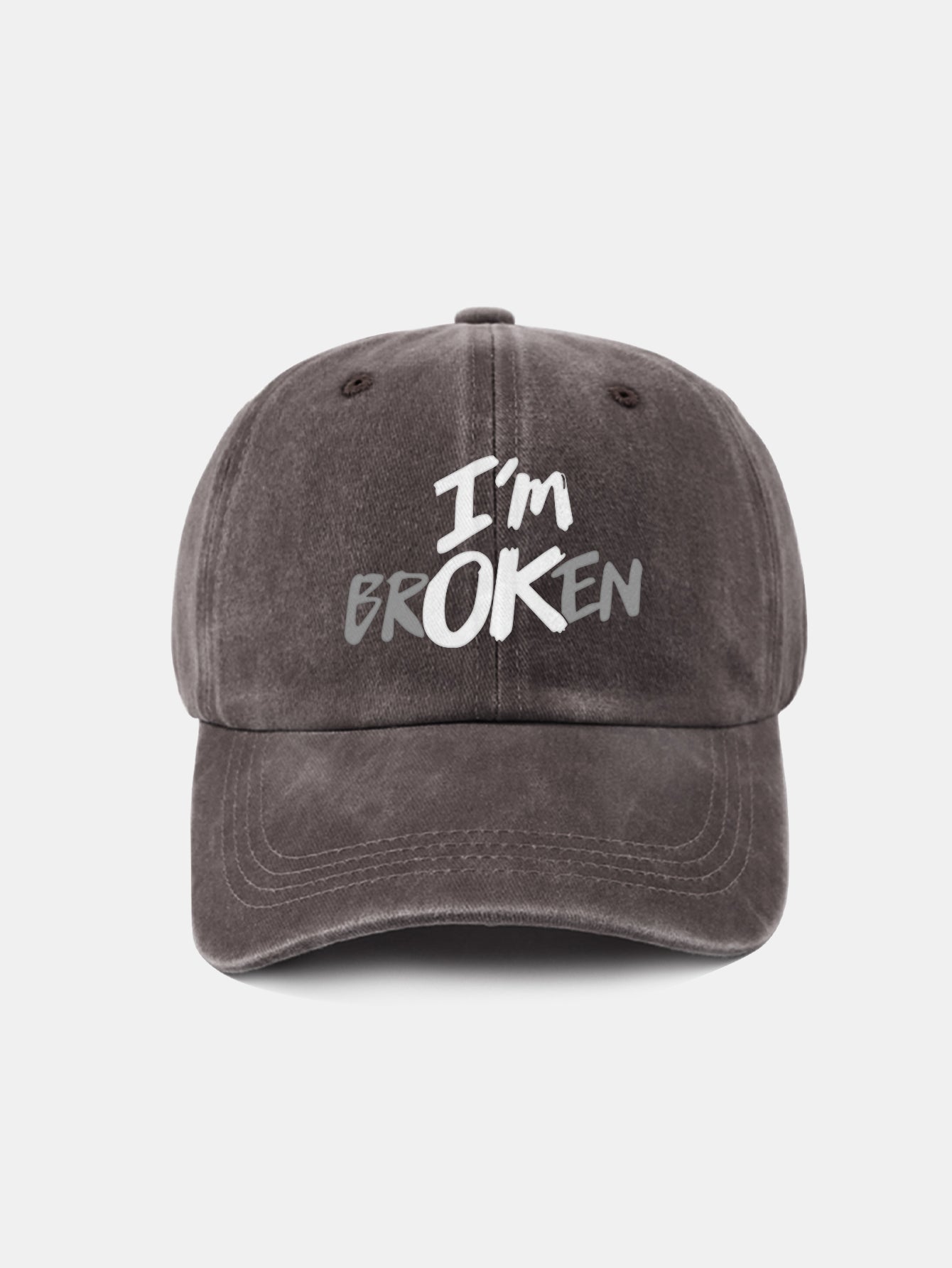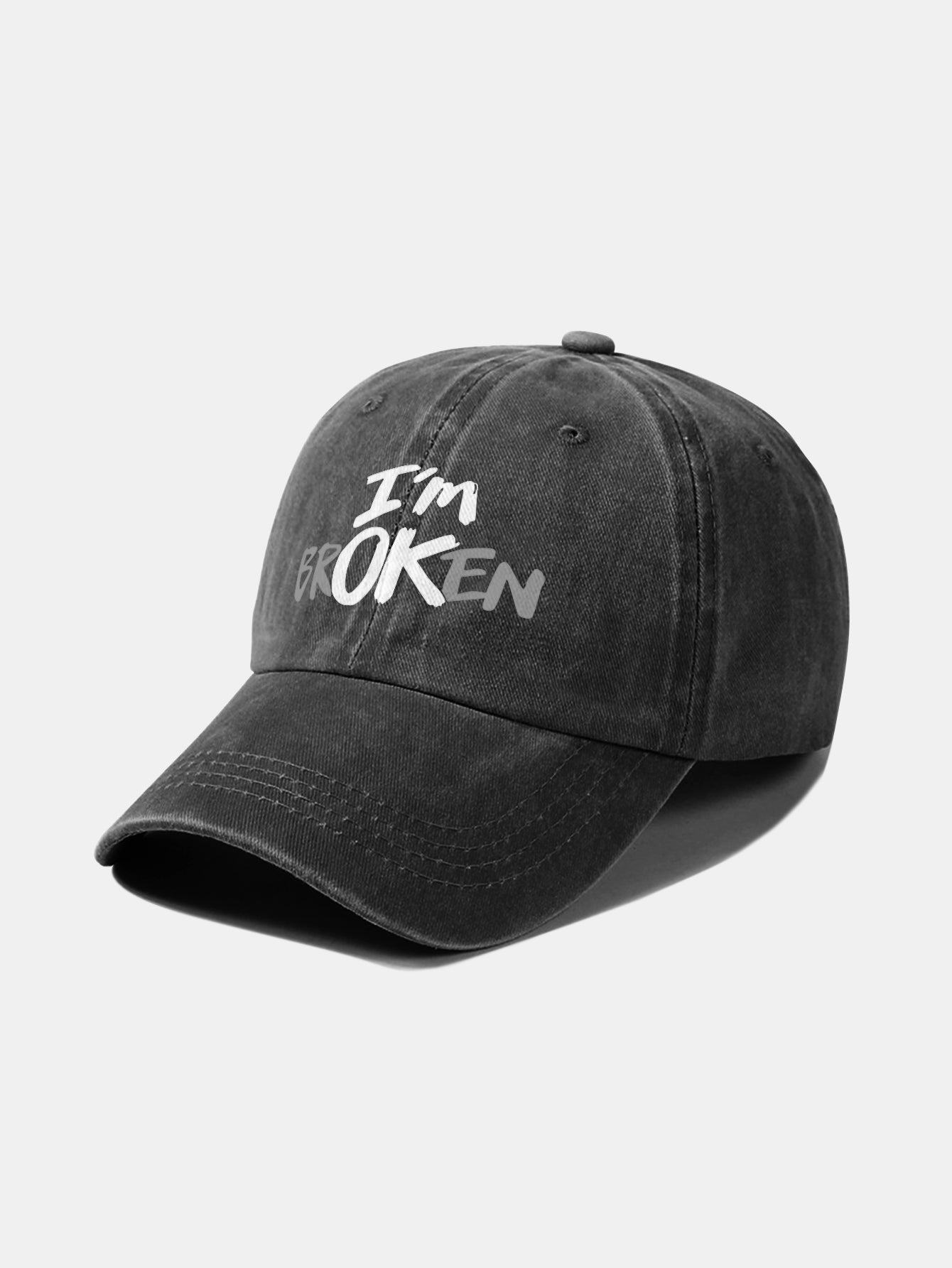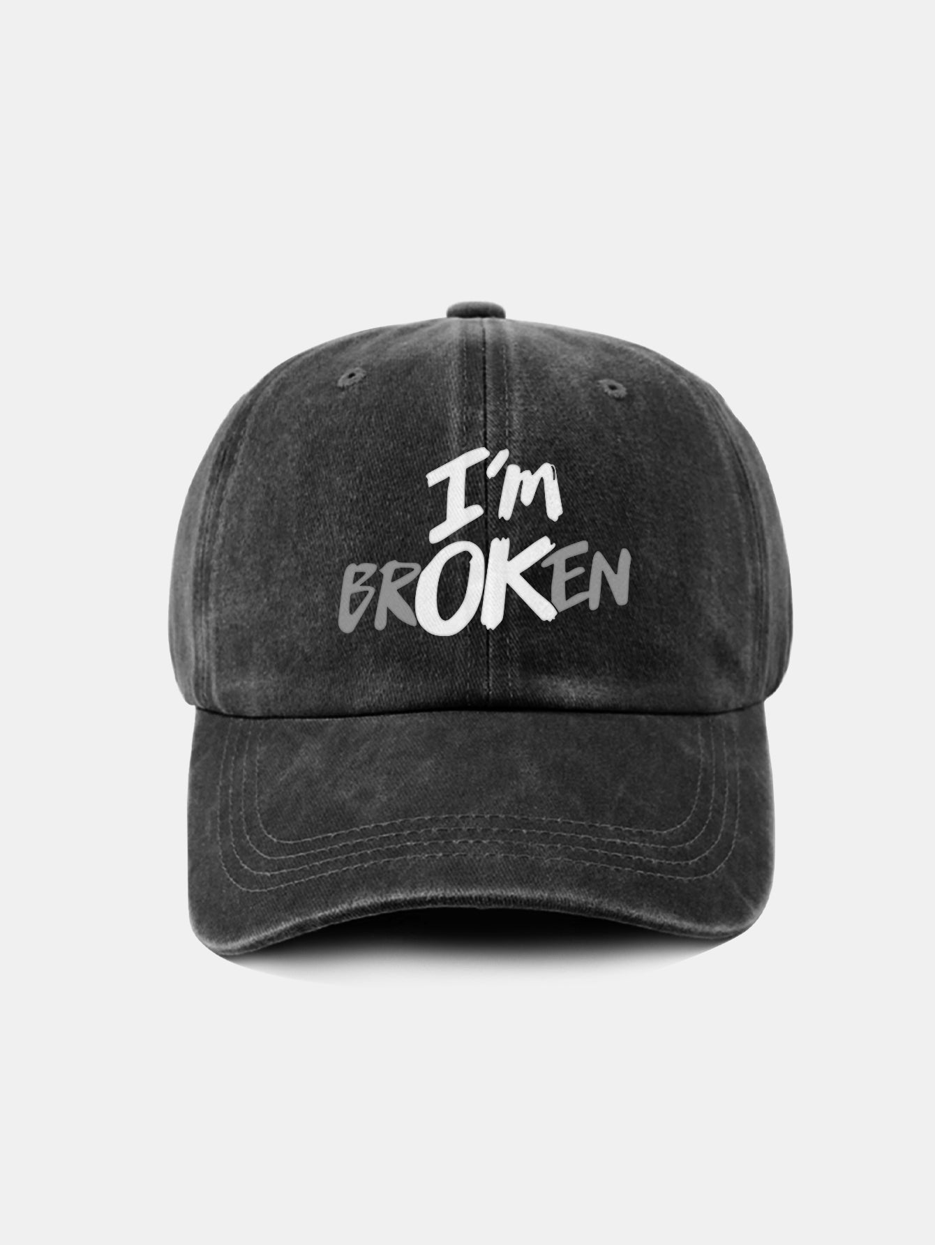 Add a touch of edgy attitude to your everyday look with the "I'm Broken" Print Washed Baseball Cap. Featuring a distressed and vintage-style wash on the front, this cap combines comfort with personality. Designed with an adjustable strap for a custom fit, it's perfect for casual outings, streetwear styling, or expressing your unique vibe.