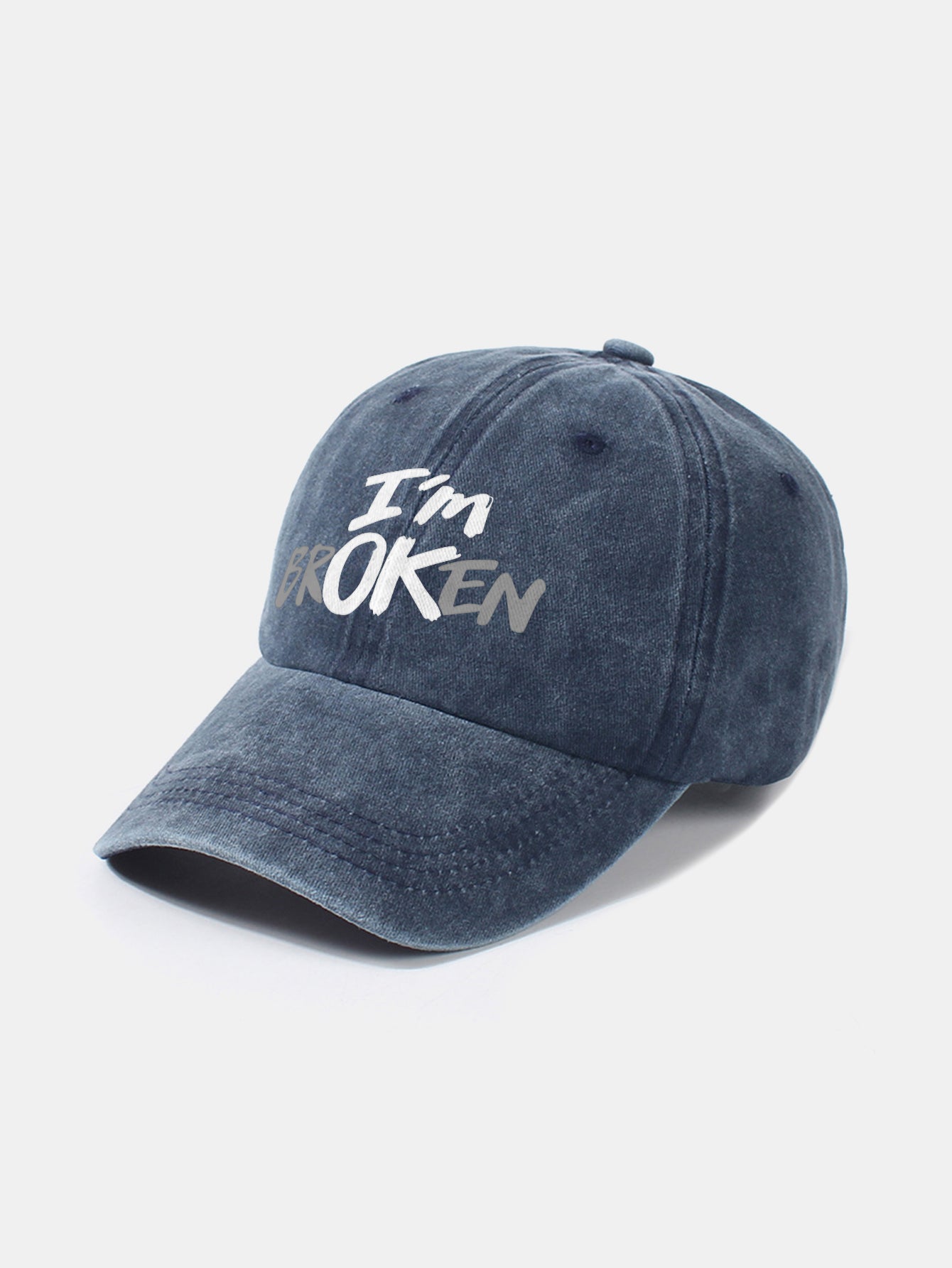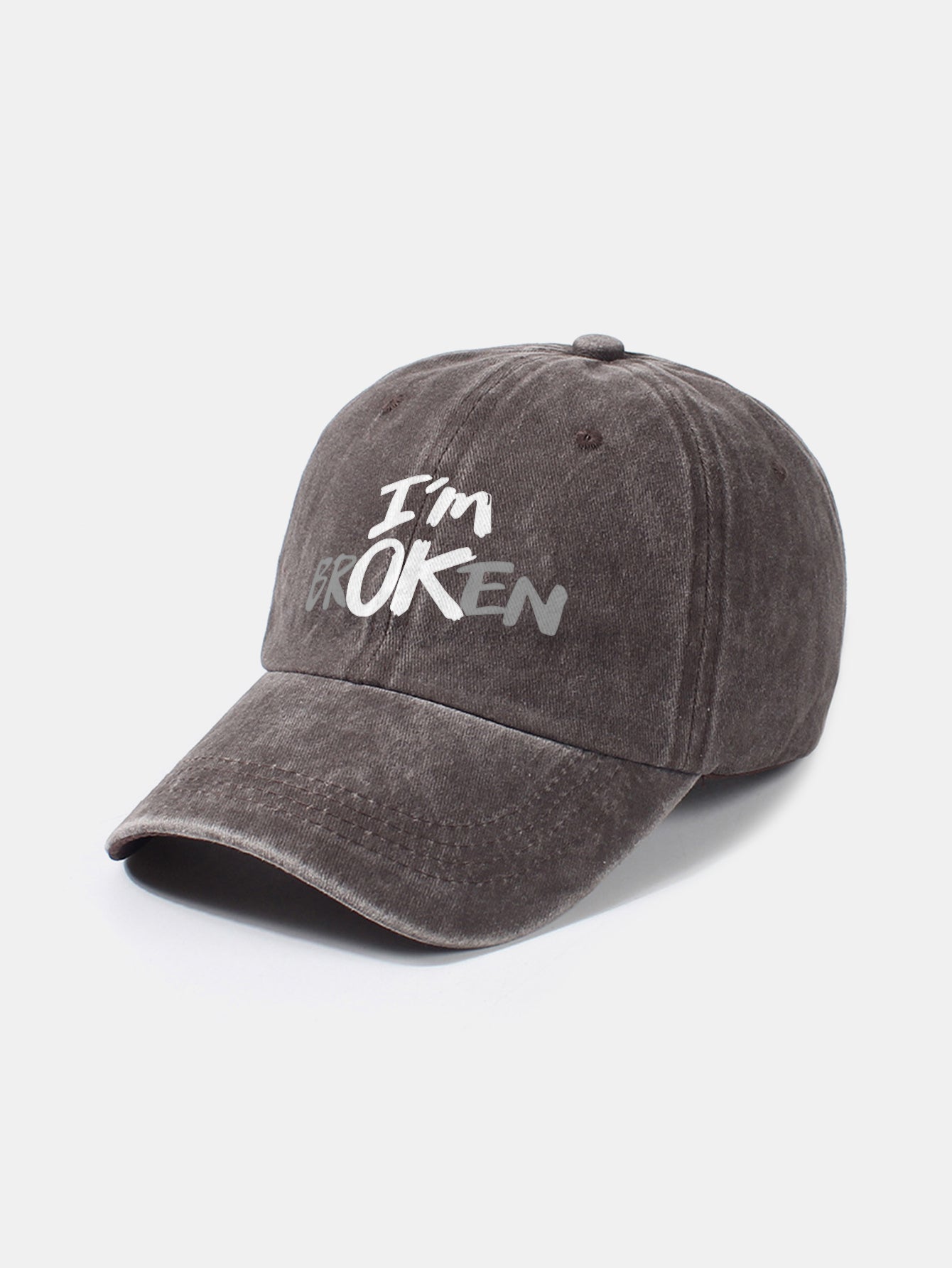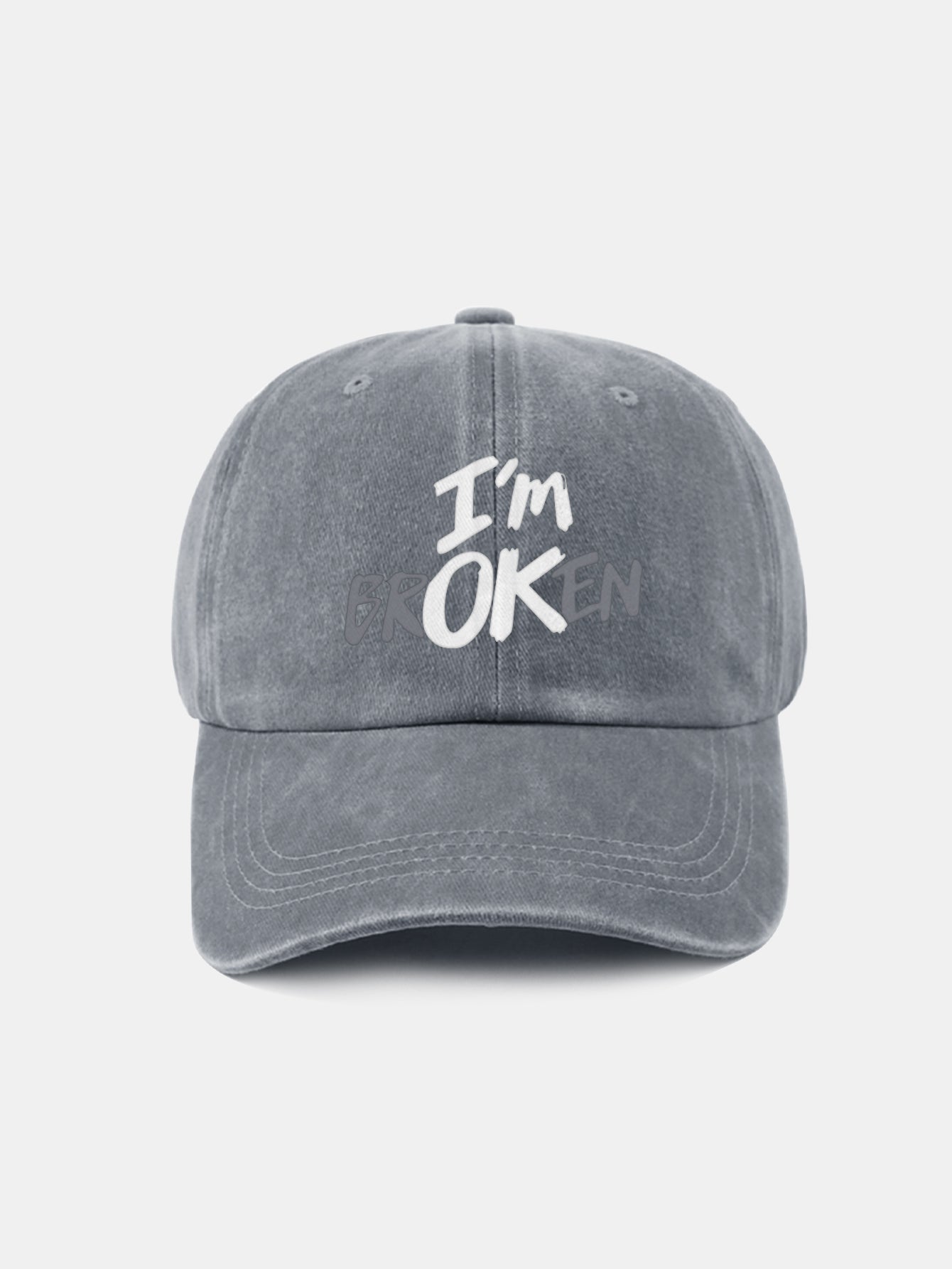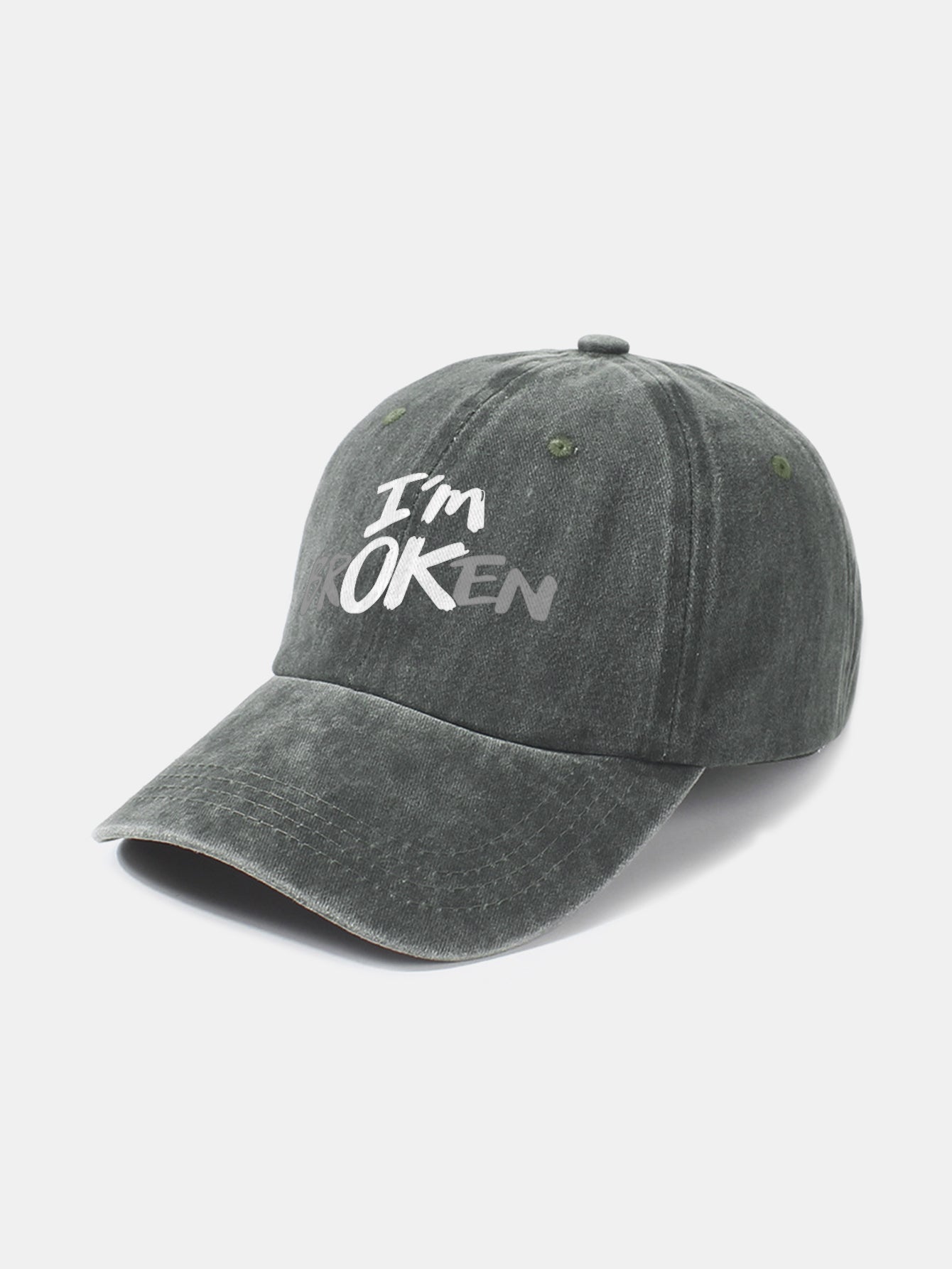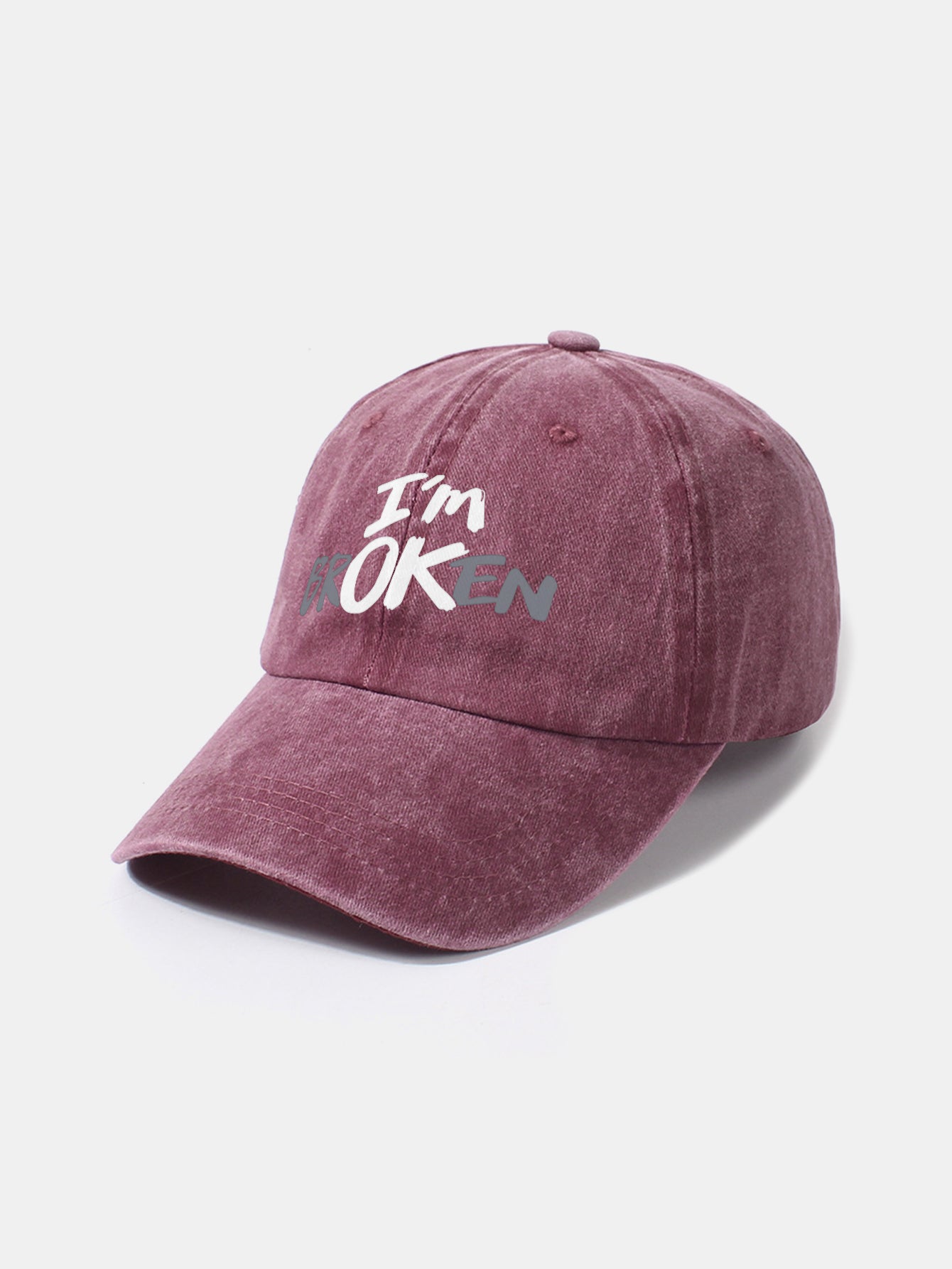 Add a touch of edgy attitude to your everyday look with the "I'm Broken" Print Washed Baseball Cap. Featuring a distressed and vintage-style wash on the front, this cap combines comfort with personality. Designed with an adjustable strap for a custom fit, it's perfect for casual outings, streetwear styling, or expressing your unique vibe.