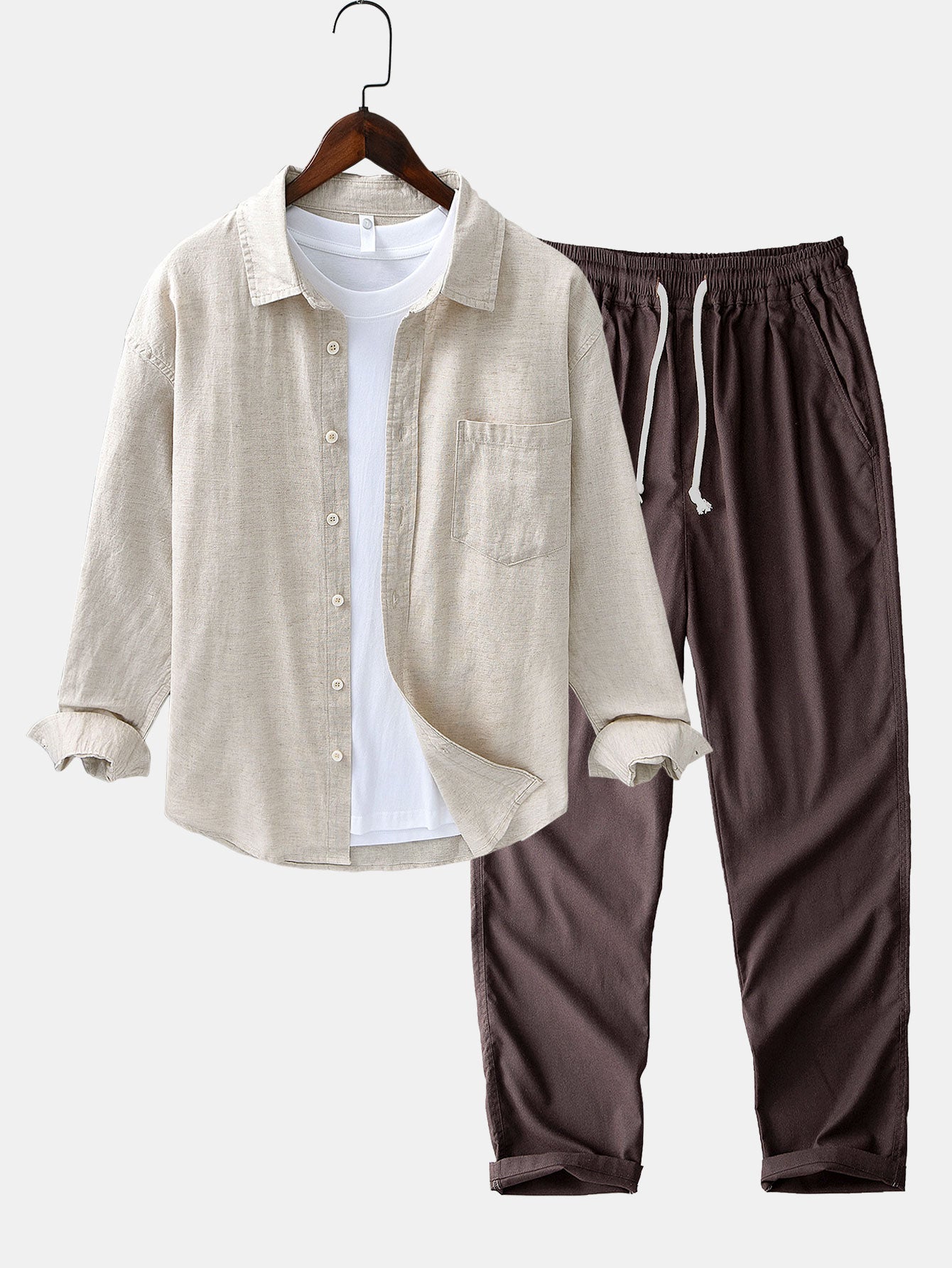Long Sleeve Linen Cotton Shirt With Pocket & Straight Leg Linen Pants