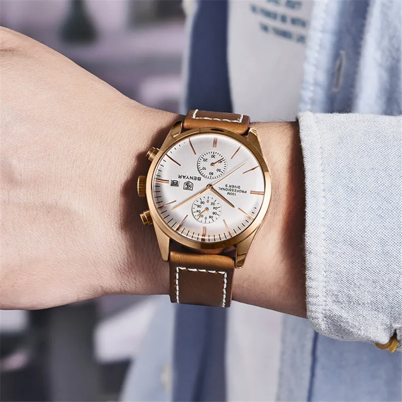 The luxury sport quartz watch is the perfect accessory for the modern man who appreciates both precision and sophistication. With a slim leather strap, this chronograph watch offers a bold, stylish look suitable for both casual and formal occasions. Thanks to its 3ATM water resistance, you can wear it with confidence in any situation, from a workout session to a business meeting. The durable design and high-quality quartz movement ensure reliable timekeeping wherever life takes you.
