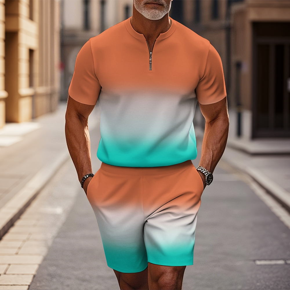 Men's fashion casual round-neck zipper geometric printed short-sleeved two-piece set 2504000008