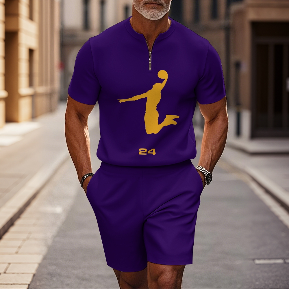 Men's fashion casual round-neck zipper geometric printed short-sleeved two-piece set 2504000030