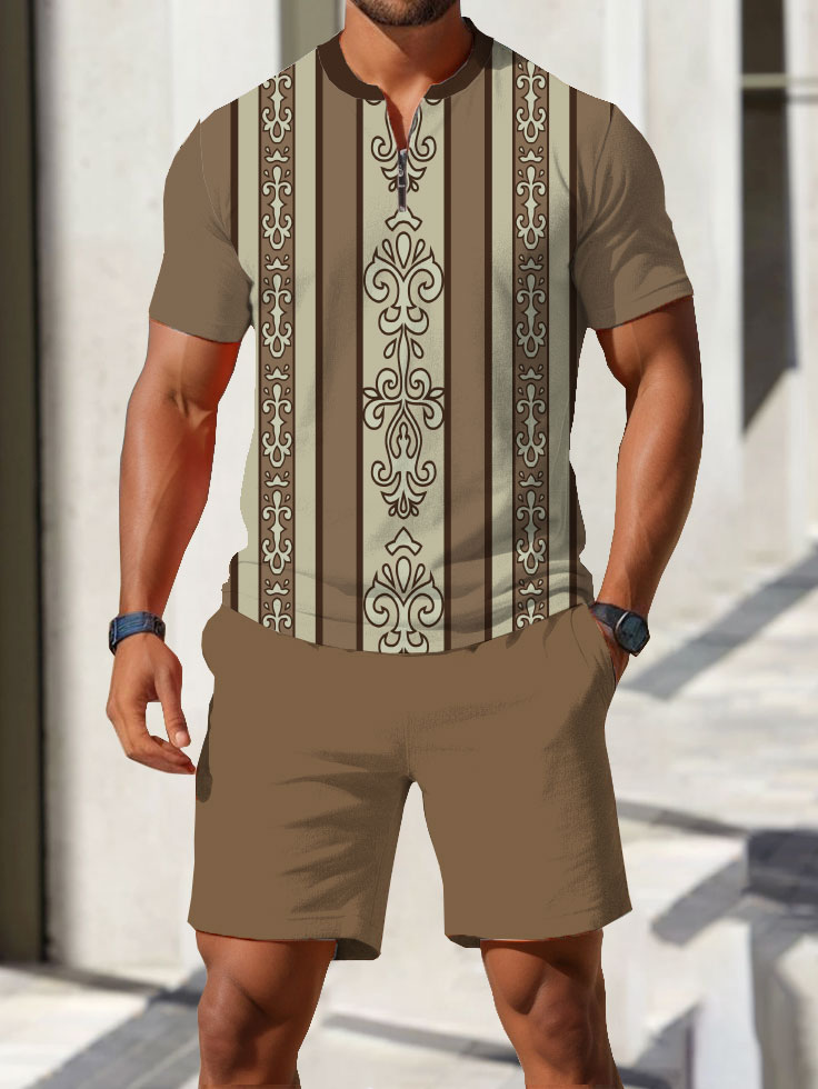 Men's fashion casual round-neck zipper geometric printed short-sleeved two-piece set 2504000049