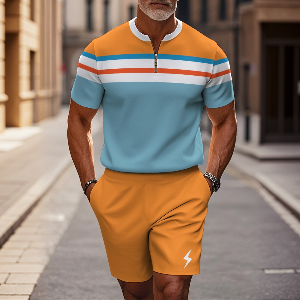 Men's fashion casual round-neck zipper geometric printed short-sleeved two-piece set 2504000052
