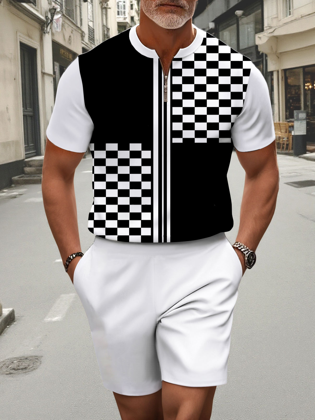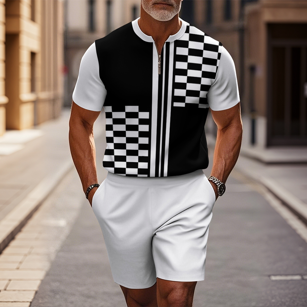 Men's fashion casual round-neck zipper geometric printed short-sleeved two-piece set 2504000124