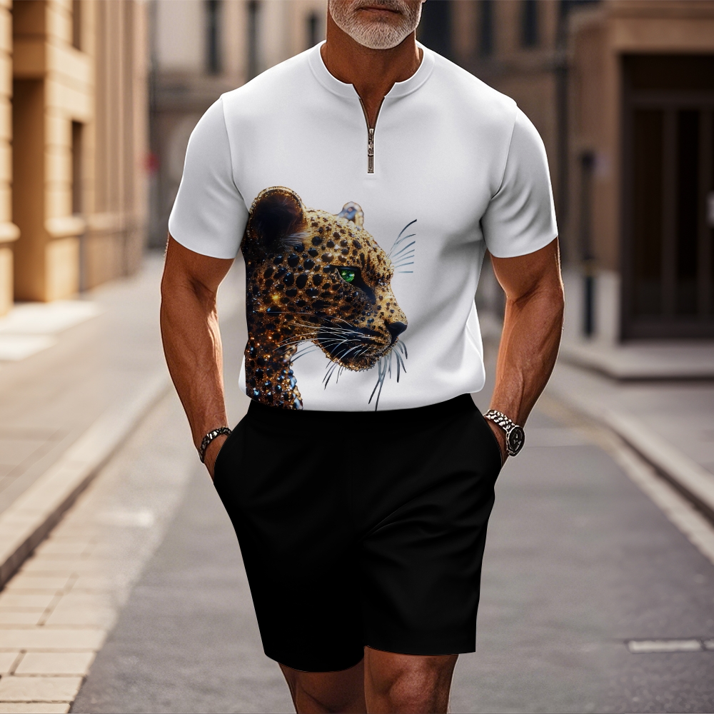Men's fashion casual round-neck zipper geometric printed short-sleeved two-piece set 2504000567