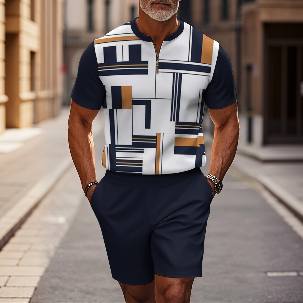 Men's fashion casual round-neck zipper geometric printed short-sleeved two-piece set 2505000007