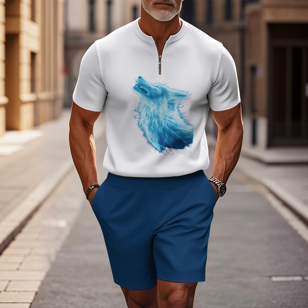 Men's fashion casual round-neck zipper geometric printed short-sleeved two-piece set 2505000009