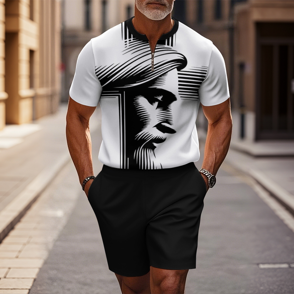 Men's fashion casual round-neck zipper geometric printed short-sleeved two-piece set 2505000025