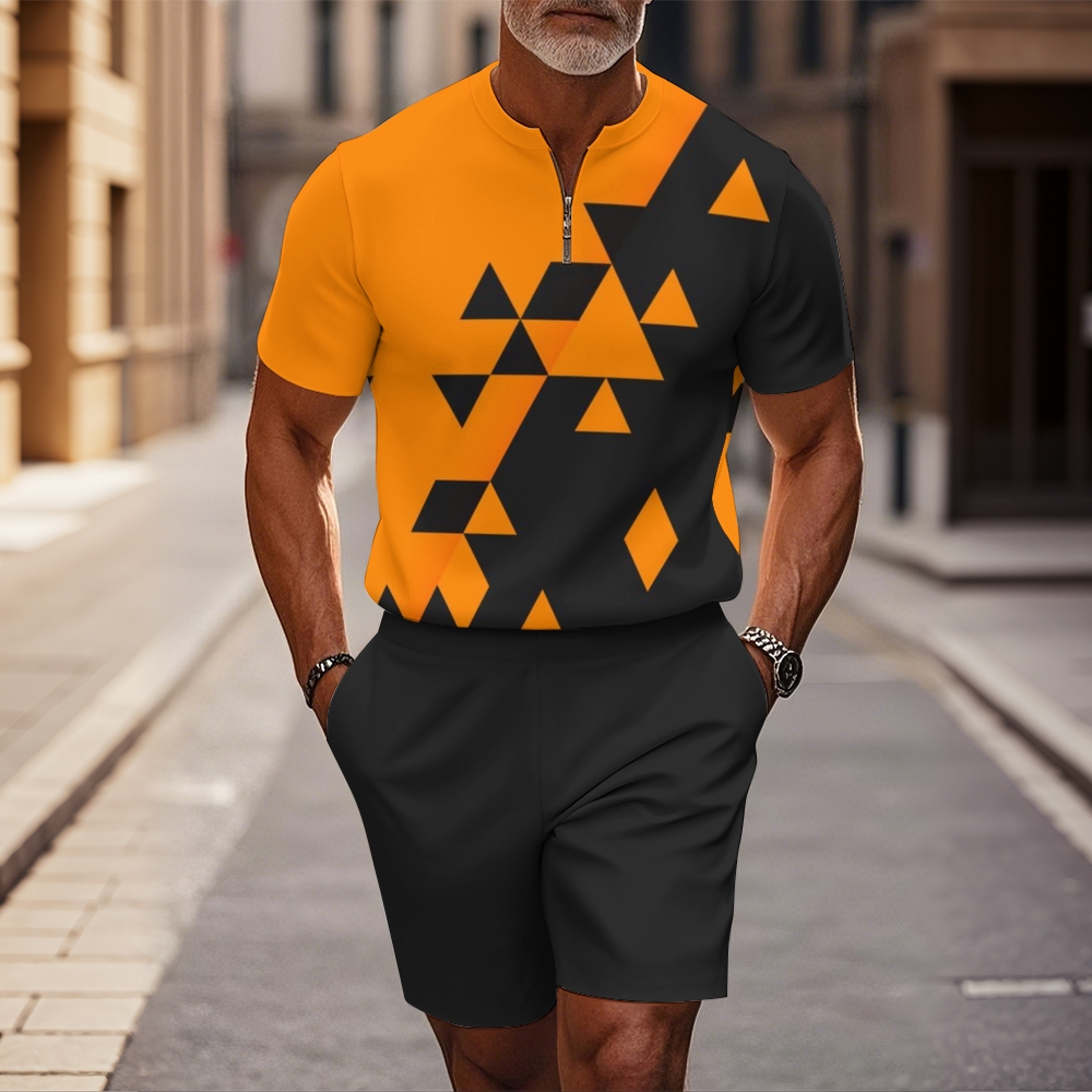 Men's fashion casual round-neck zipper geometric printed short-sleeved two-piece set 2505000433