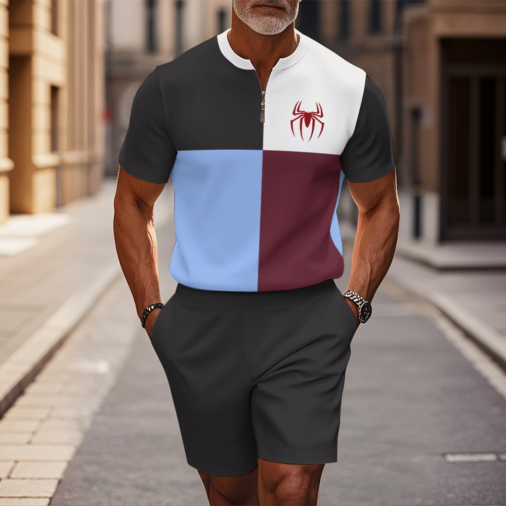 Men's fashion casual round-neck zipper geometric printed short-sleeved two-piece set 2505000480