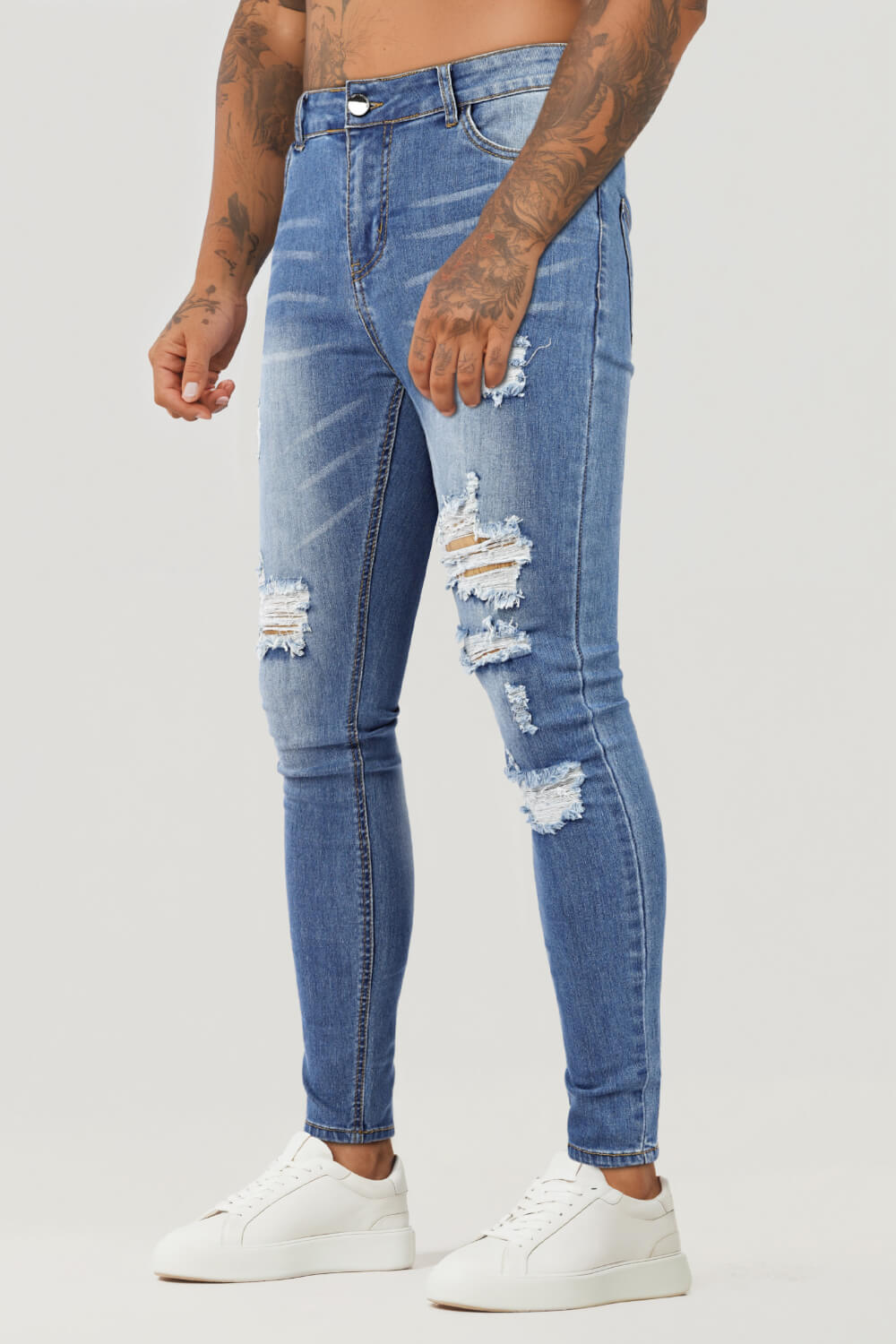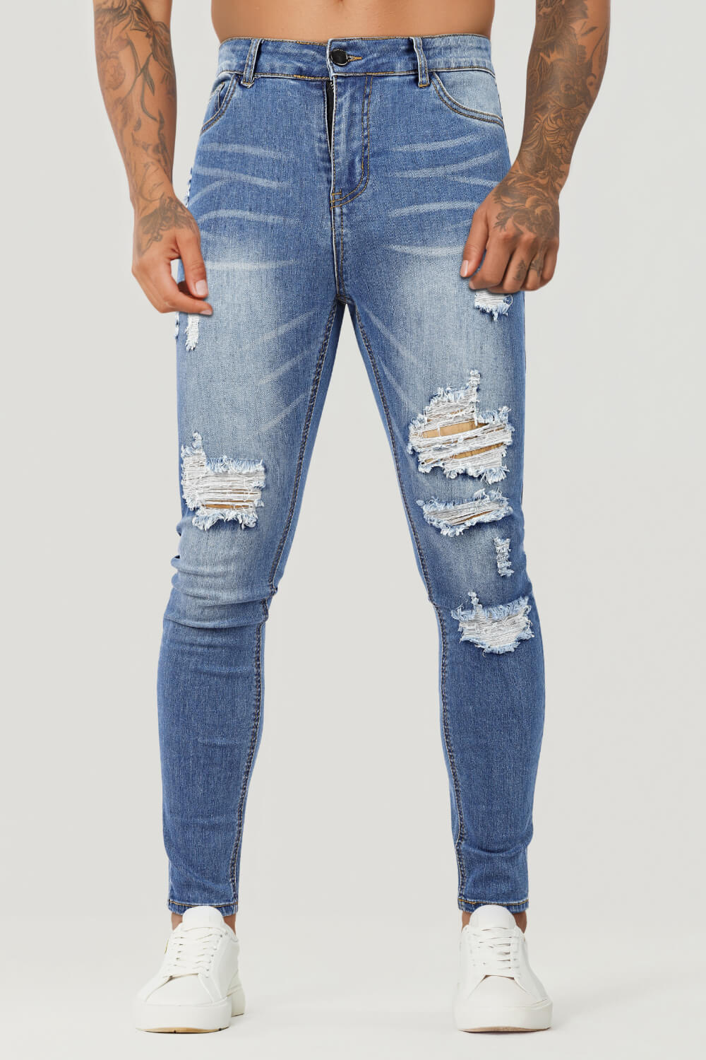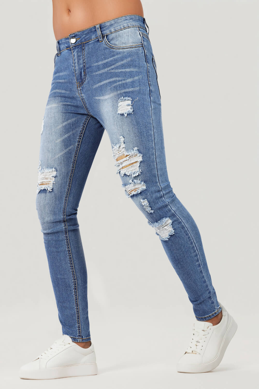 Super comfortable and high-stretch denim jeans designed with a form-flattering, muscular thighs fit. Our washed blue jeans fit your lower body to wear all day long and can be paired with our popular basic tops.