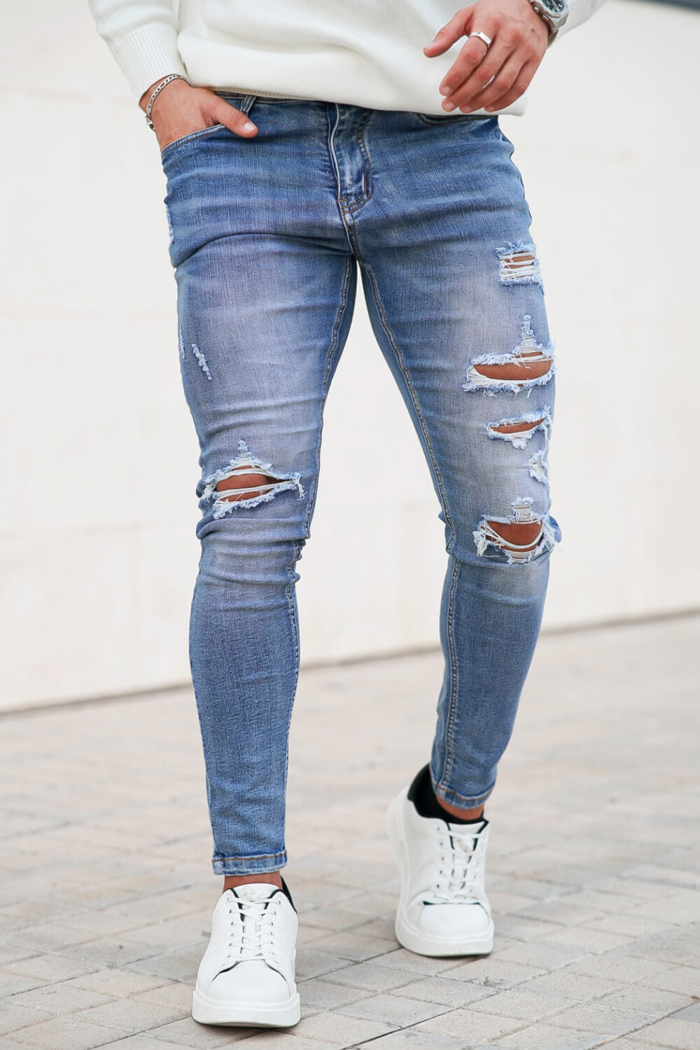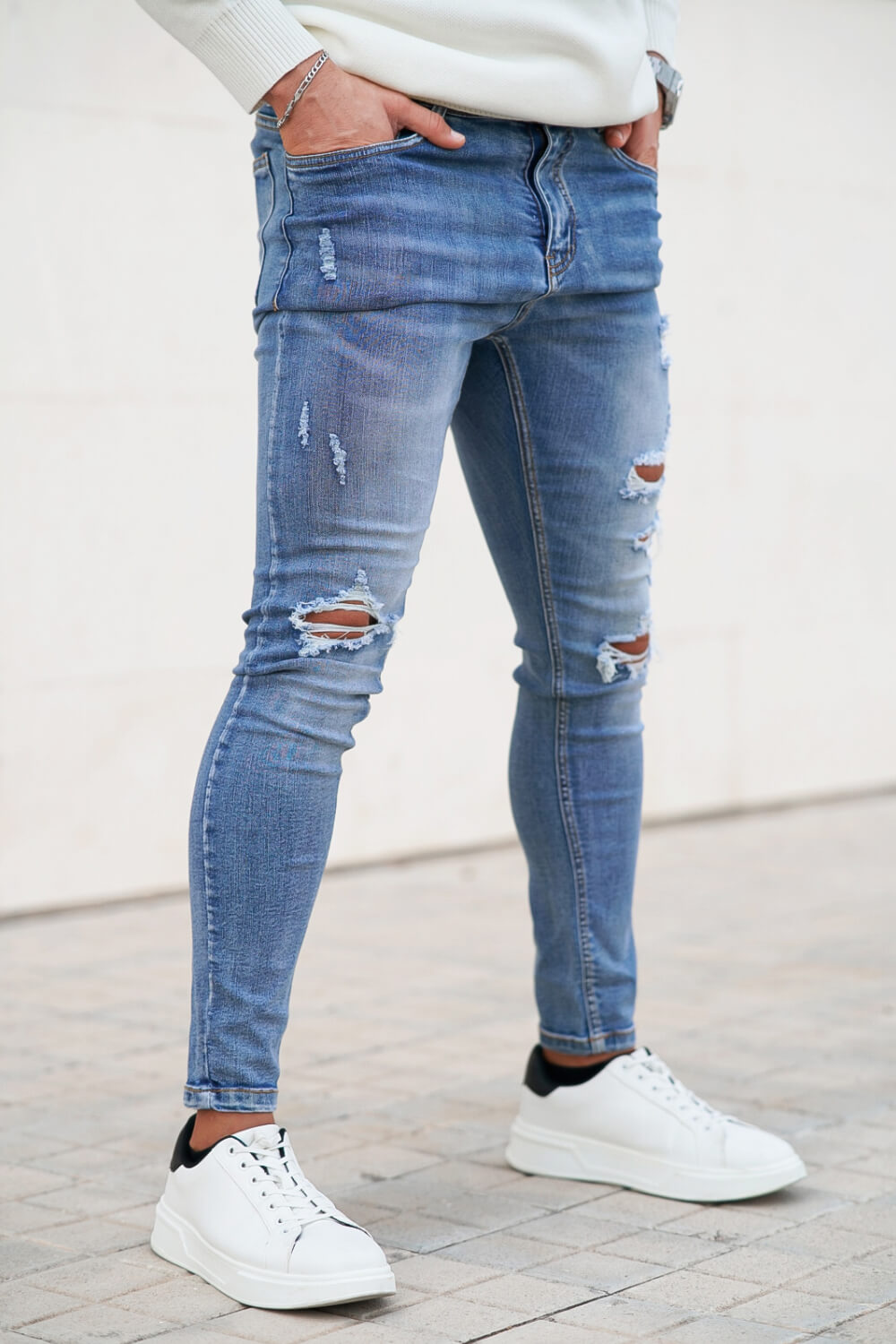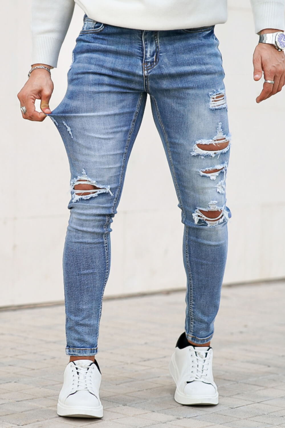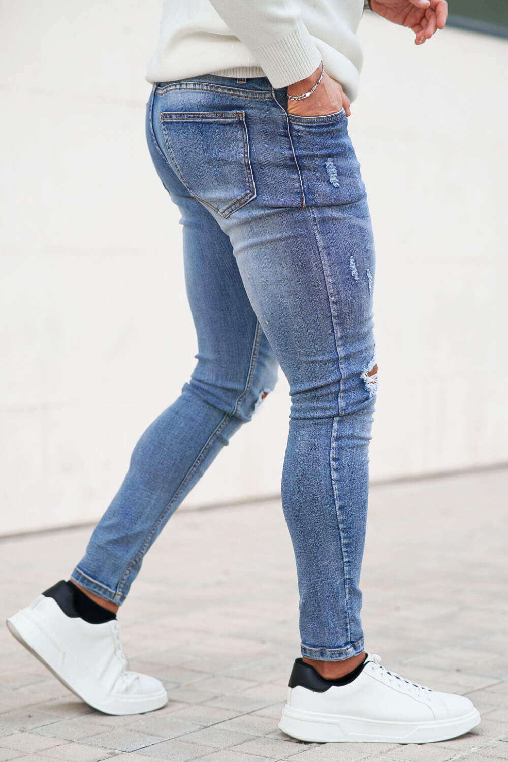 Super comfortable and high-stretch denim jeans designed with a form-flattering, muscular thighs fit. Our washed blue jeans fit your lower body to wear all day long and can be paired with our popular basic tops.