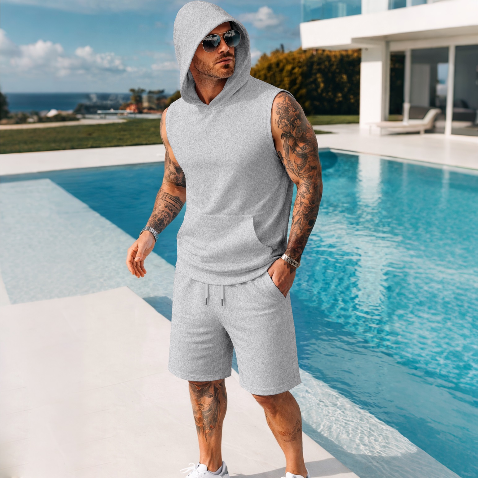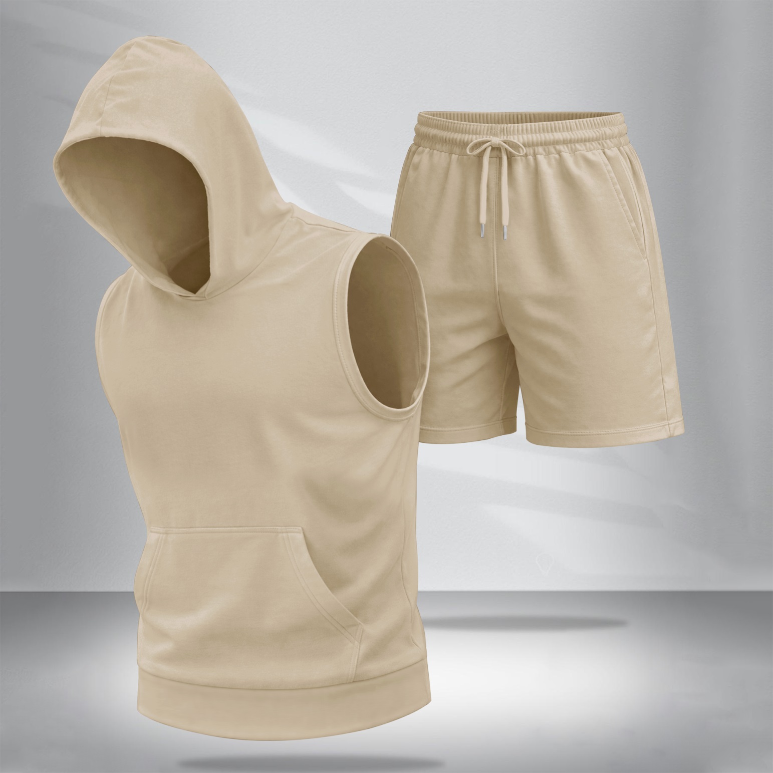 Style Type: Men's Spring/Summer Two-Piece SetCollar Type: Crew NeckSleeve Length: SleevelessPants Length: ShortsSeason: Spring, SummerStyle: Casual, Athletic, MinimalistFitness: Regular FitWashing Instructions: Dry Clean, Machine WashDesign Details: Drawstring, Sleeveless HoodieComposition: 100% PolyesterWearing Guide: Crafted from high-quality fabric, this garment features a soft touch and excellent breathability. Whether for sports, leisure, or everyday wear, it is the ideal choice for you.