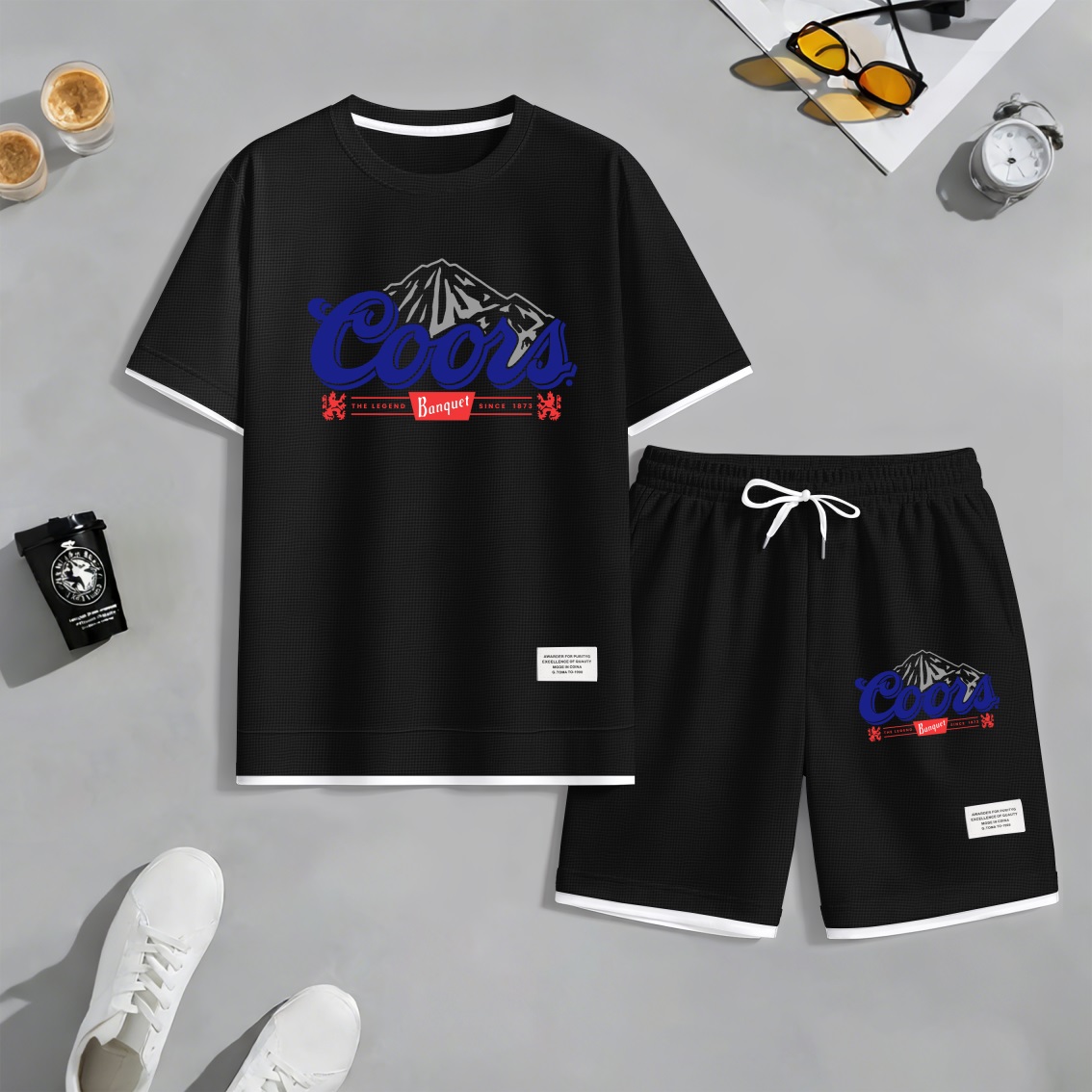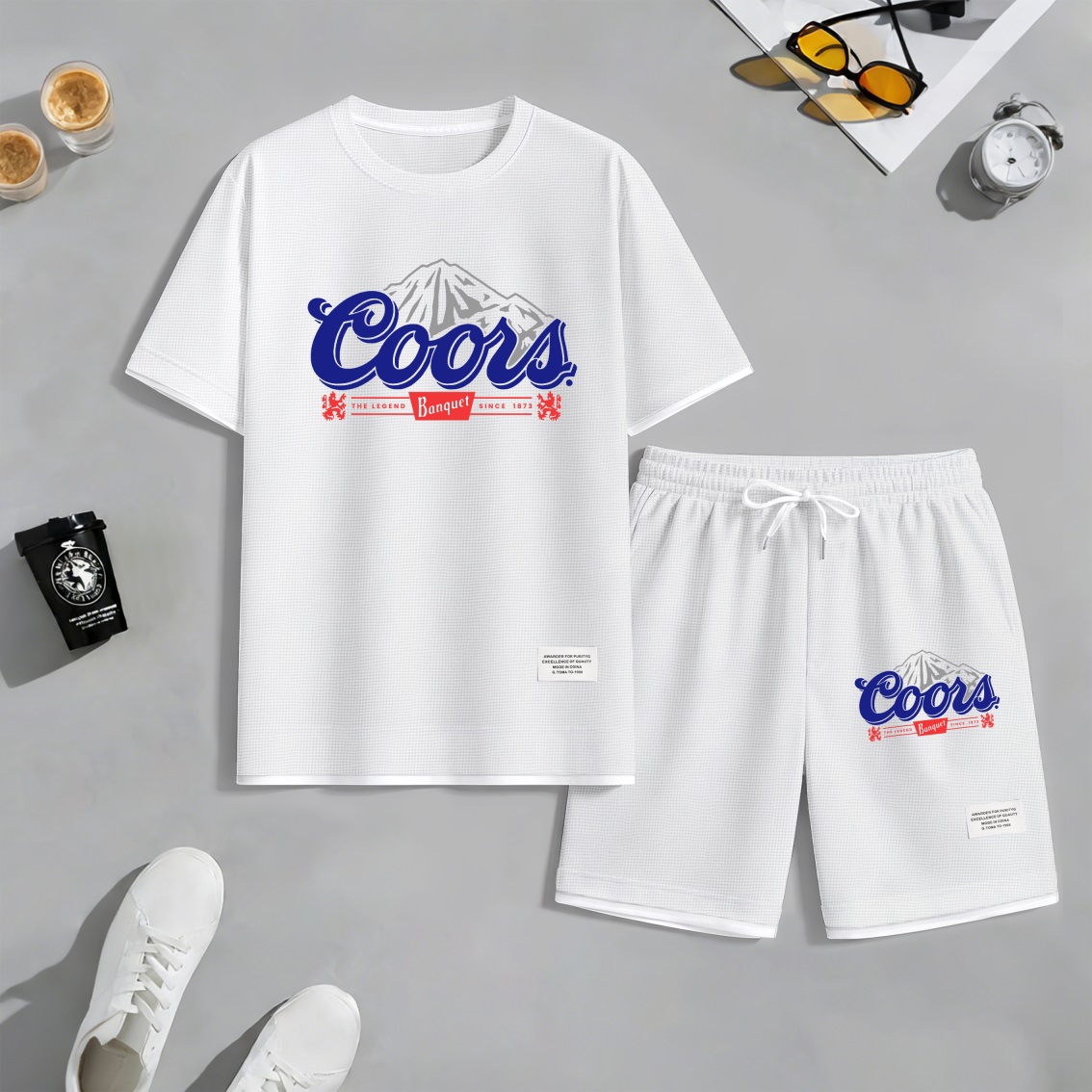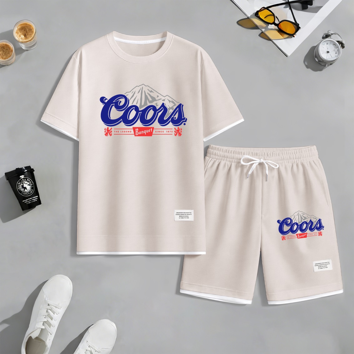 Men's American Beer Print Waffle Fabric Short-Sleeved Shirt And Shorts Set