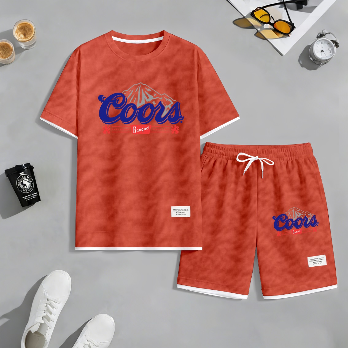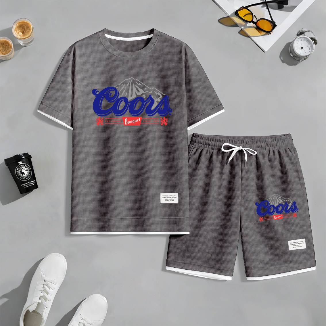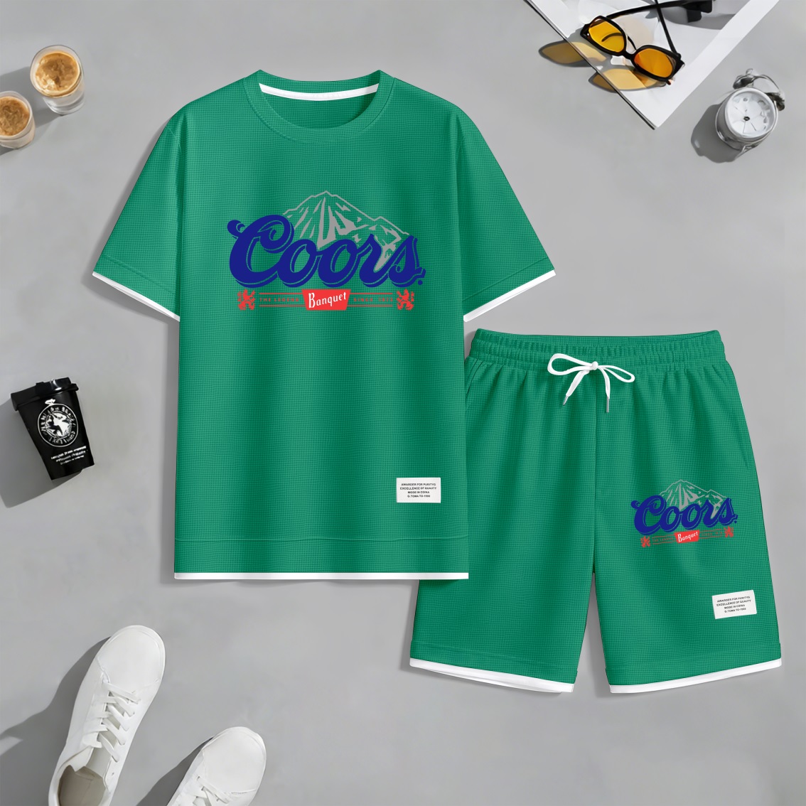 Men's American Beer Print Waffle Fabric Short-Sleeved Shirt And Shorts Set