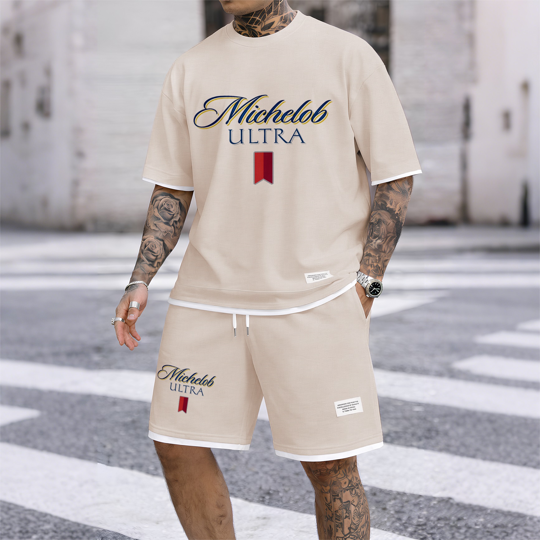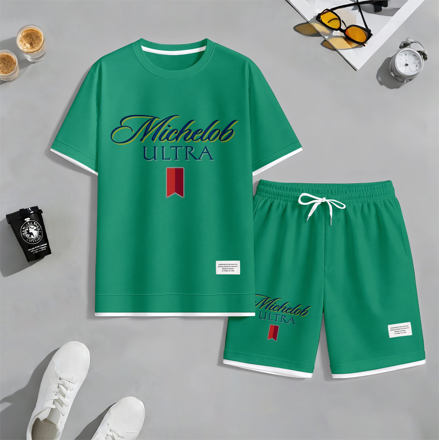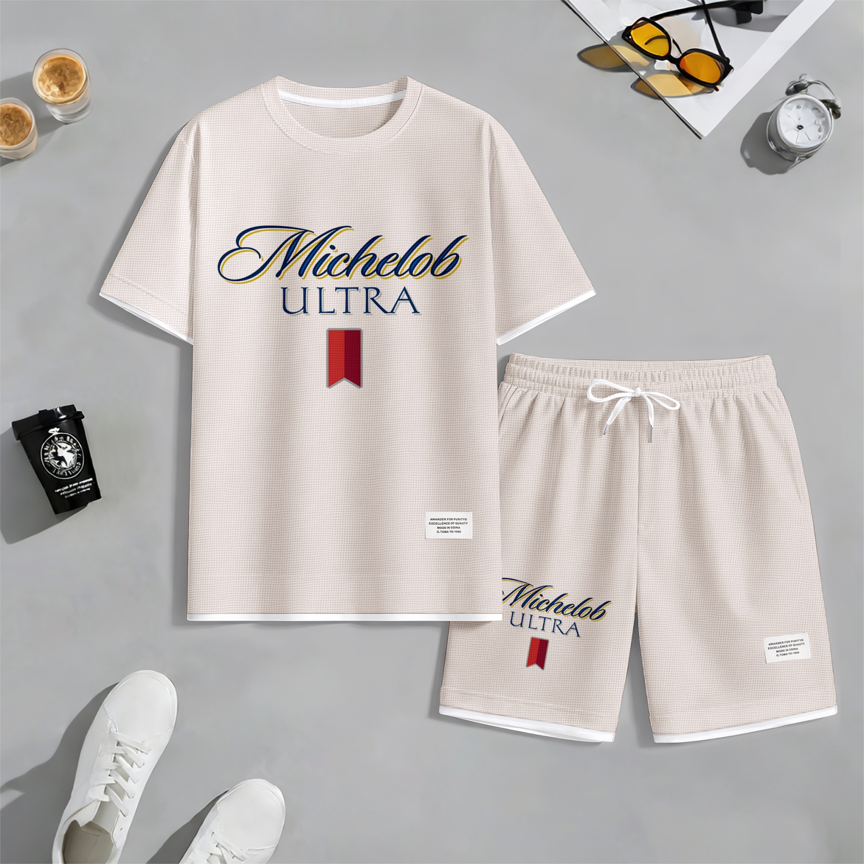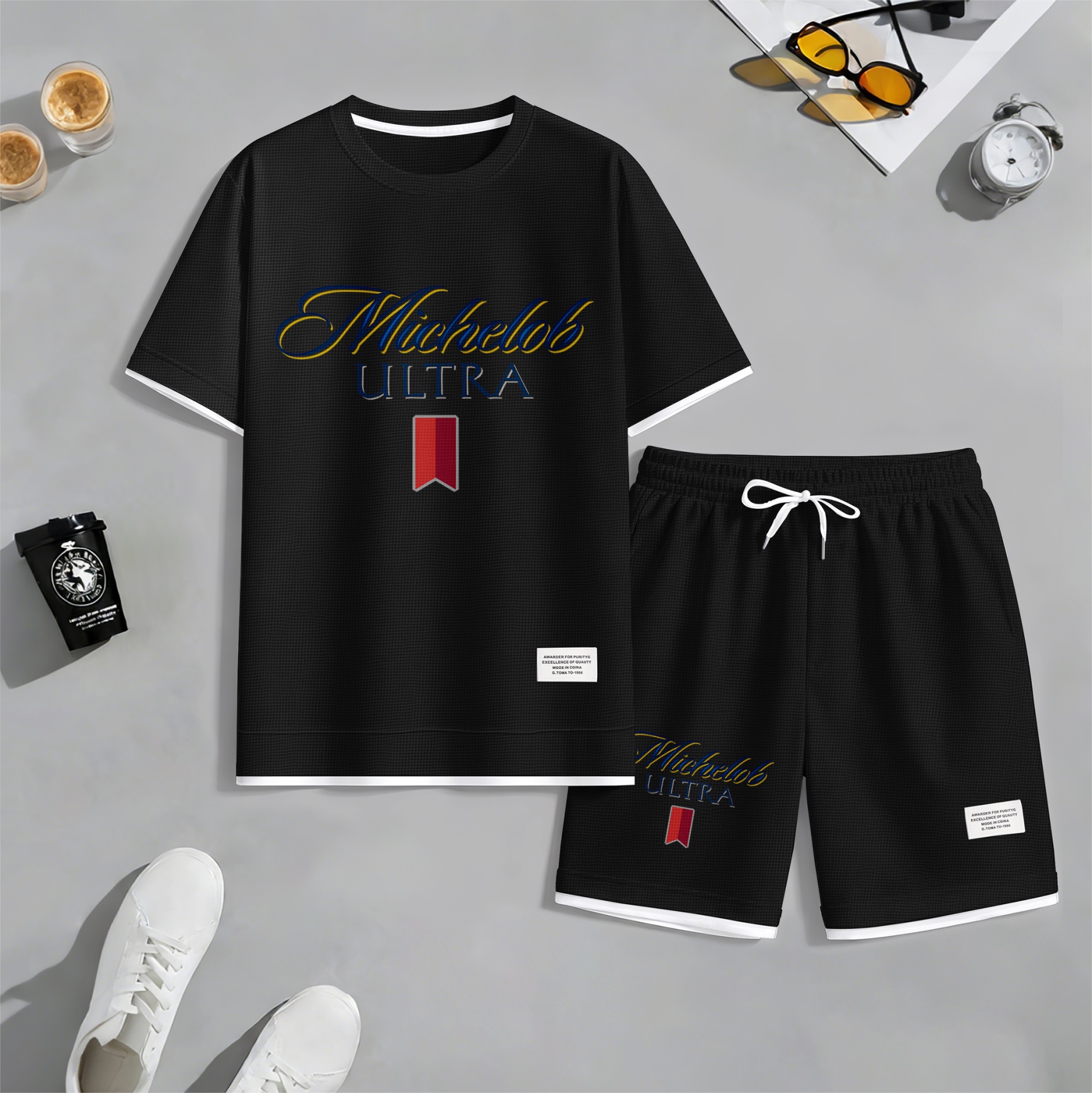 Men's Beer And Beverage Printed Drawstring Shorts Set, Suitable For Spring And Summer Wear, Casual Summer Set, Including Short-Sleeved Shirt And Shorts, Suitable For Everyday Wear And Sports 09
