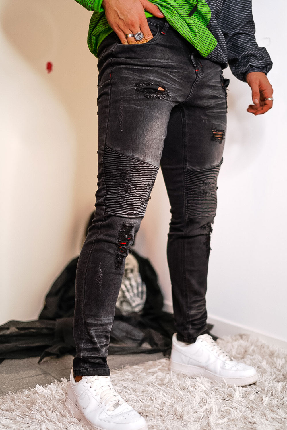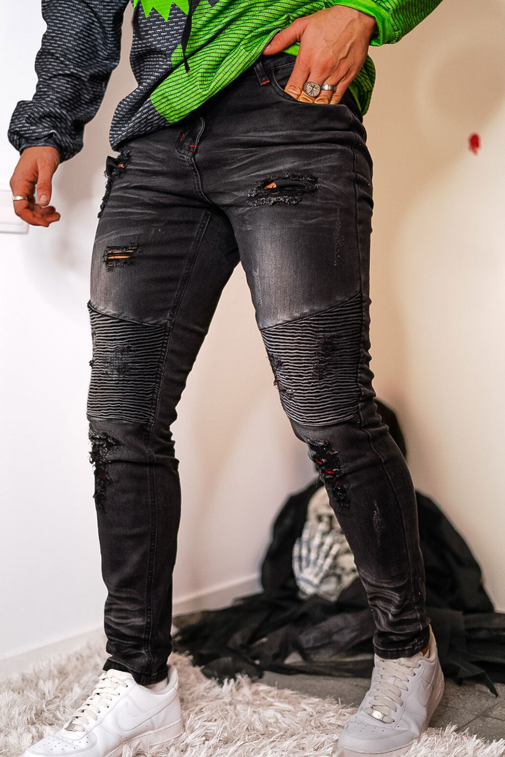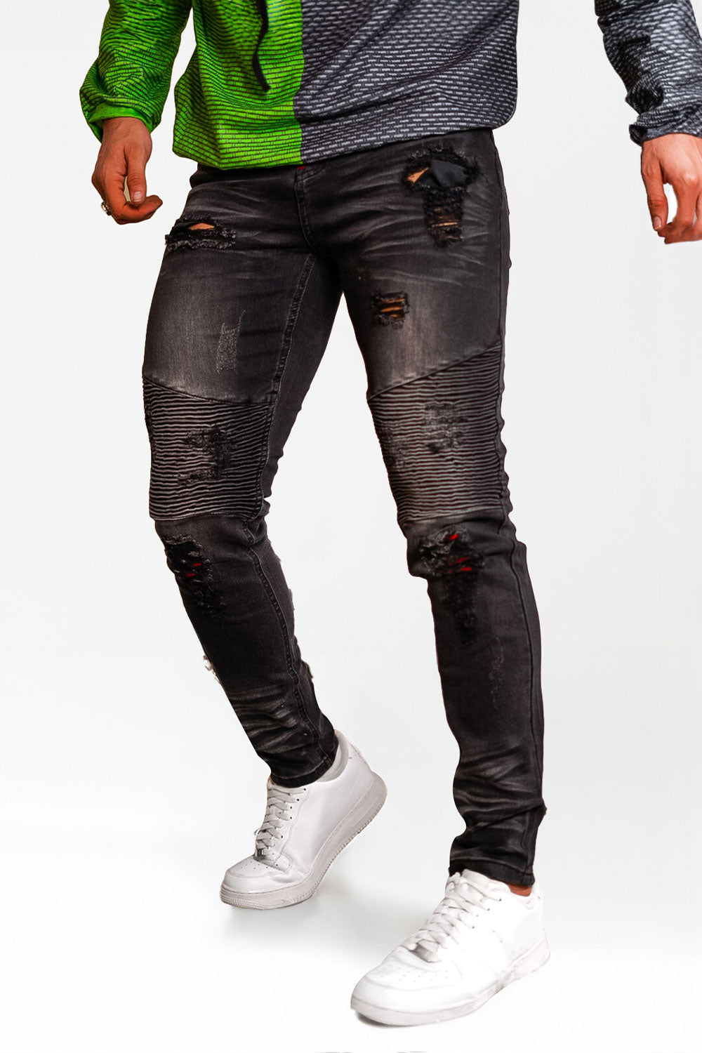 Super comfortable and high-stretch denim jeans designed with a form-flattering, muscular thighs fit. Our men's black waisted skinny jeans fit your lower body to wear all day long and can be paired with our popular basic tops.