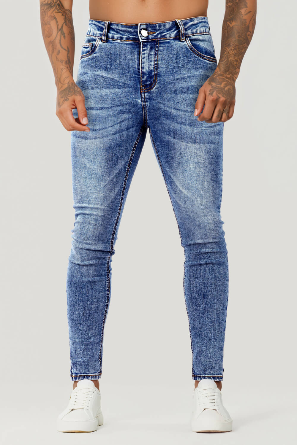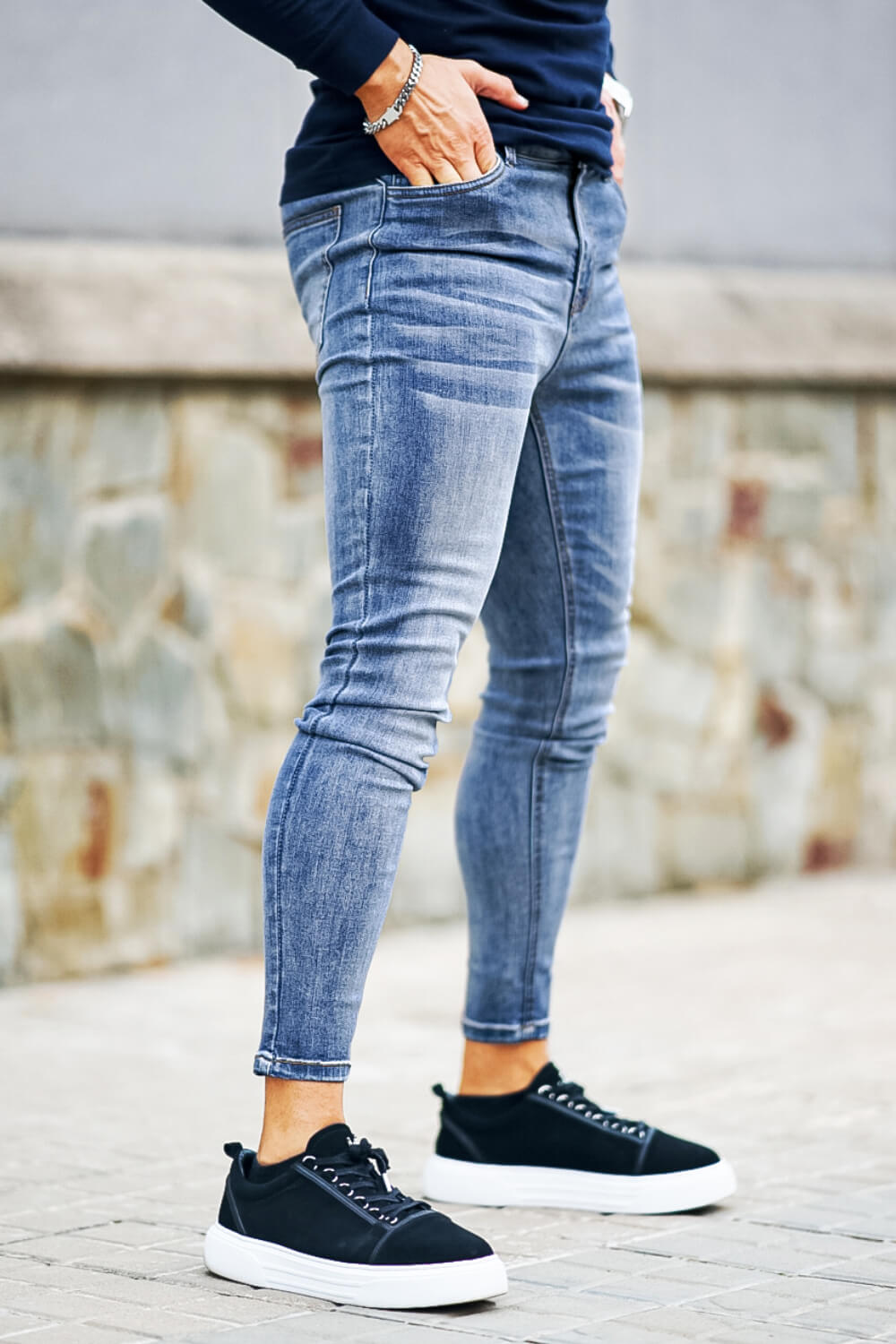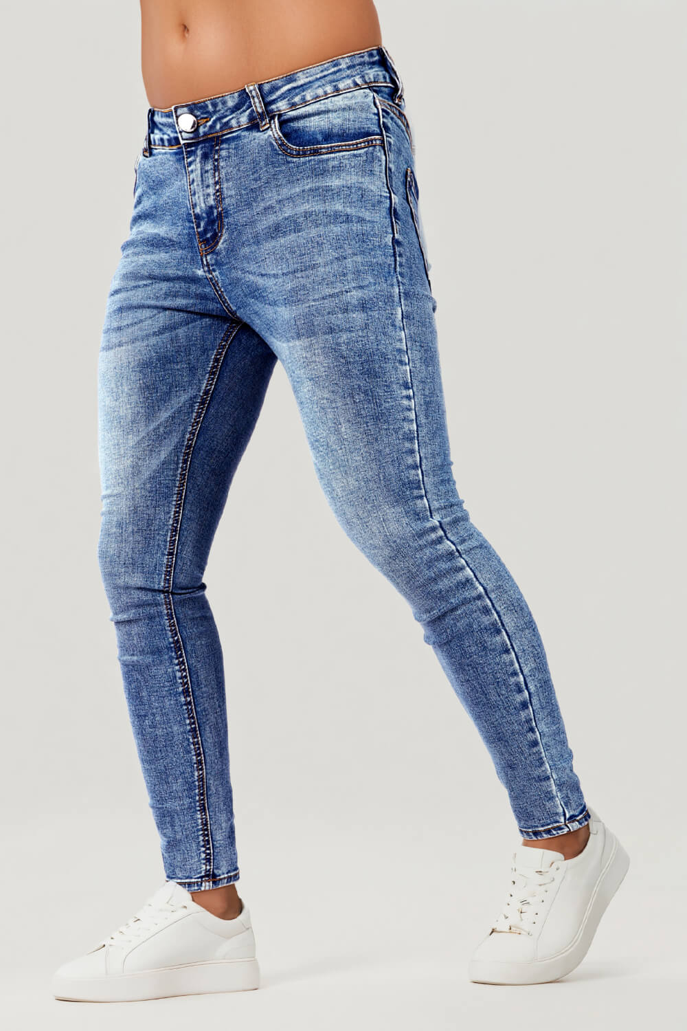 Super comfortable and high-stretch denim jeans designed with a form-flattering, muscular thighs fit. Our stripe skinny stretch jeans fit your lower body to wear all day long and can be paired with our popular basic tops.
