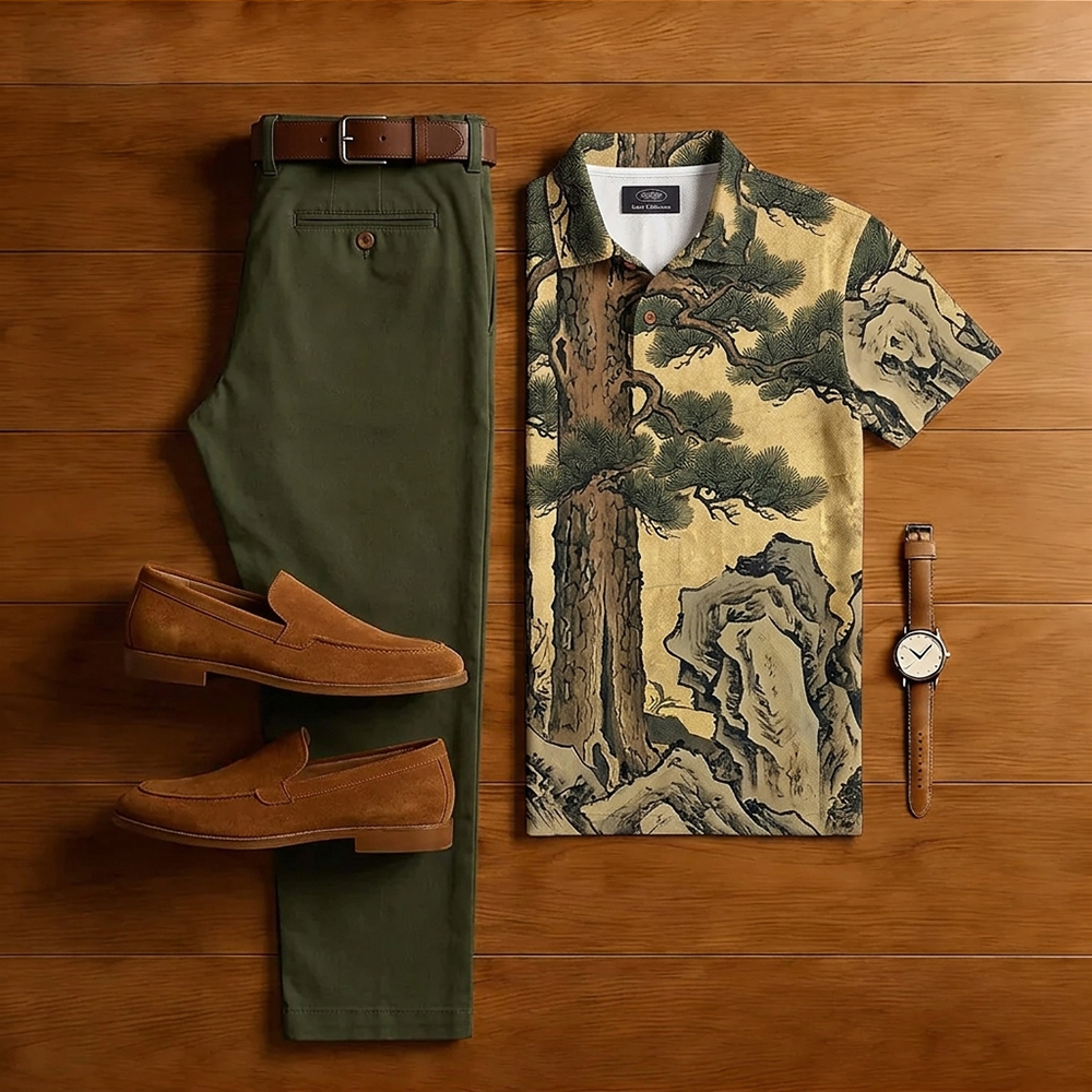 Men's Casual Apricot-Colored Plants Printed Short-Sleeve Polo Shirt And Trousers Two-Piece Set
