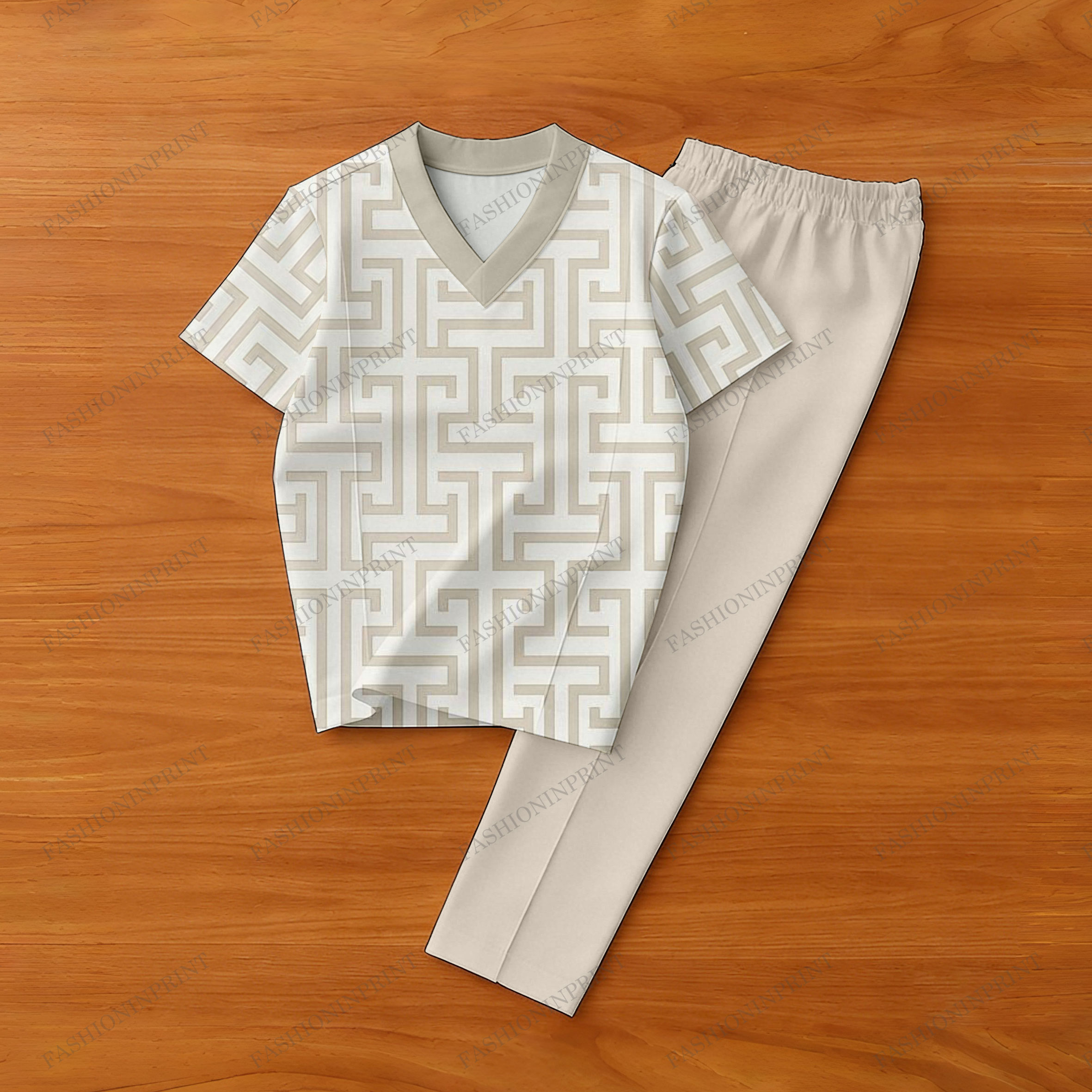 Men's Casual Apricot & White Color Matching Retro Style Printed Loose Short Sleeved V-Neck T-Shirt & Trousers Two-Piece Set