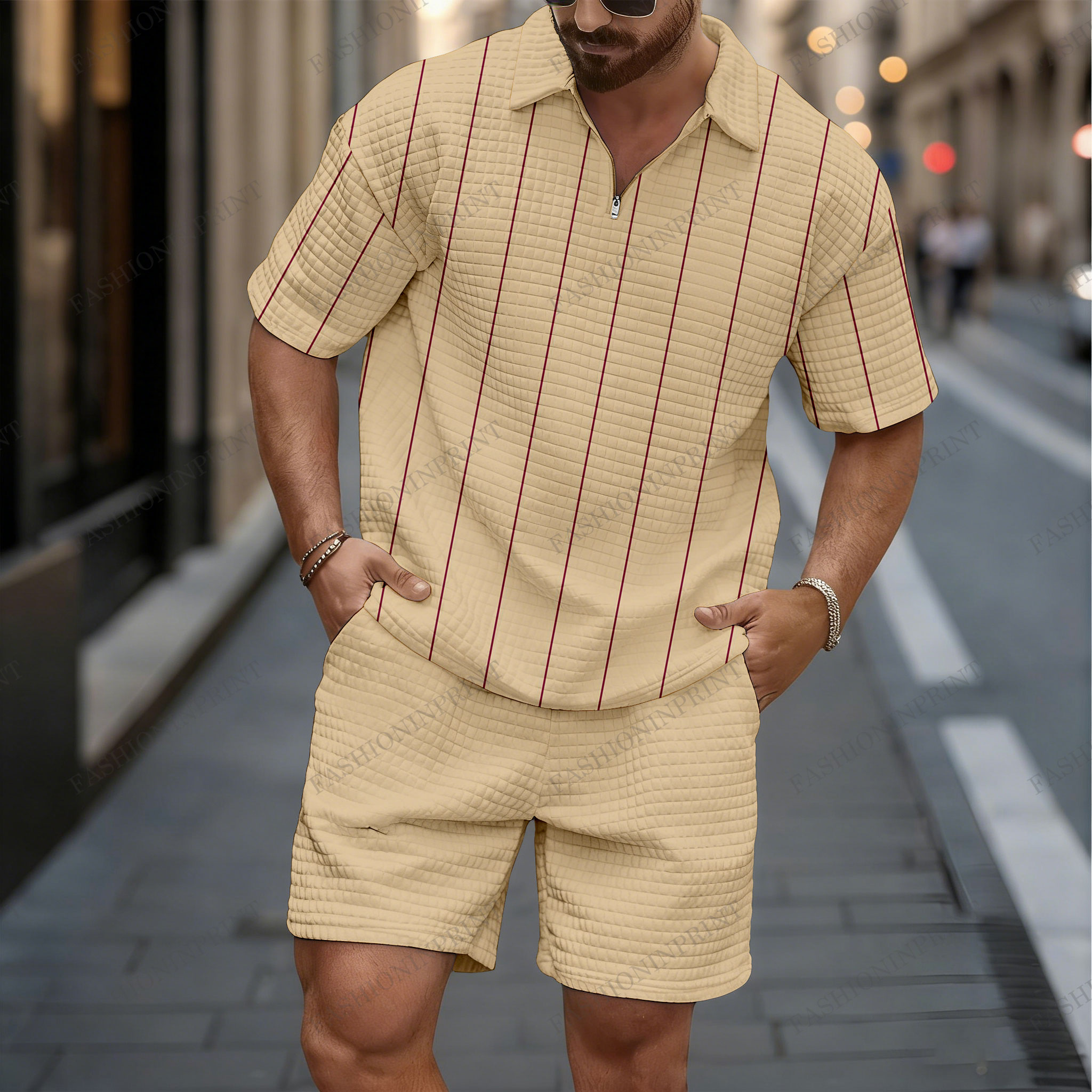 Men's Casual Beige Vertical Striped Pinted Short-Sleeved Shirt And Shorts Two-Piece Set