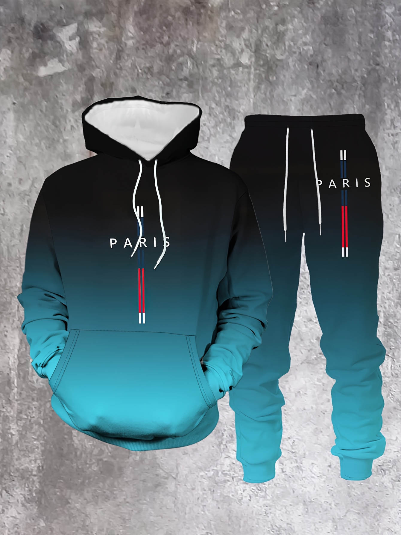 Men's Casual Black & Blue Gradient Color Matching Hoodies Long Sleeved Sweatshirts & Sweatpants Two-Piece Set
