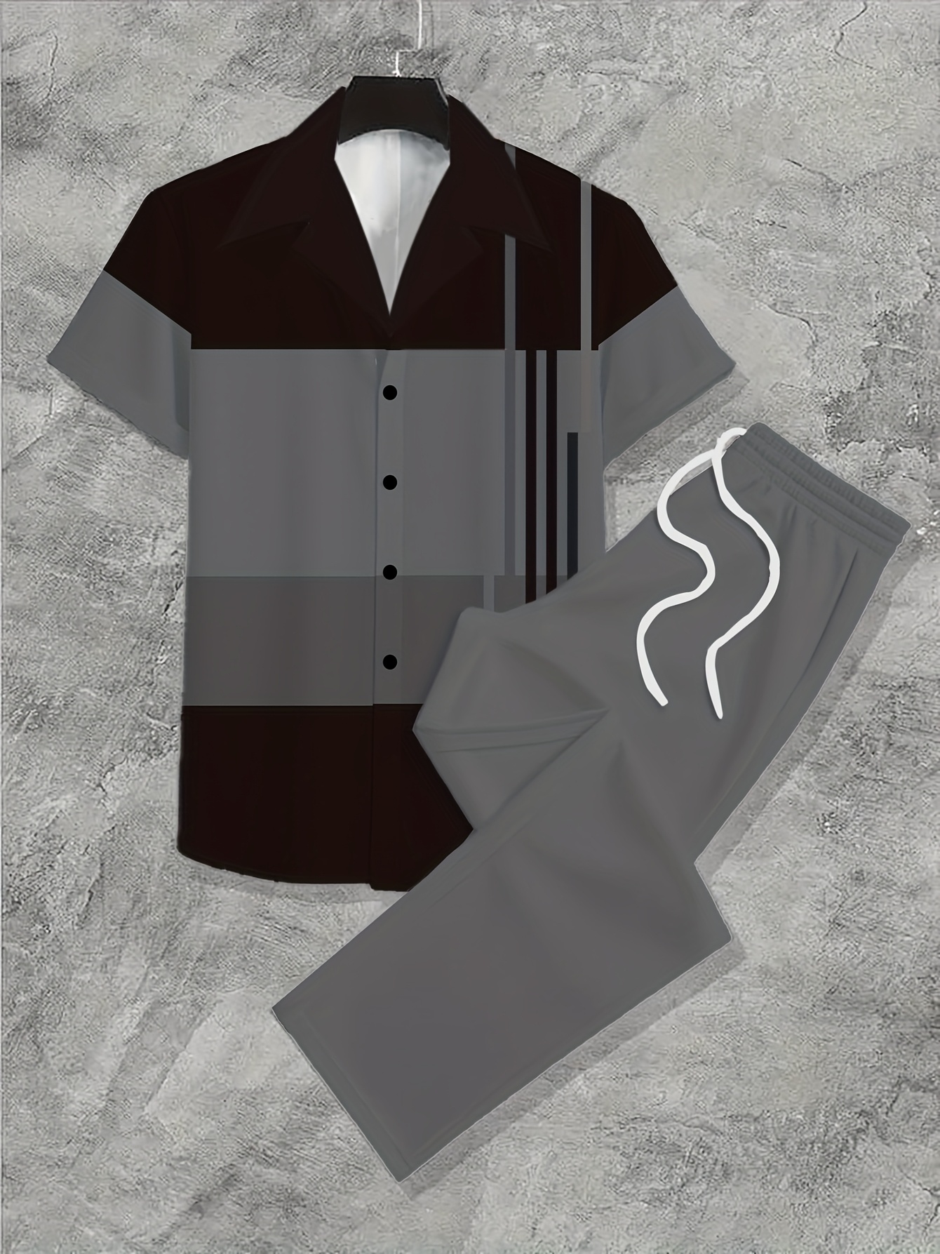 Men's Casual Black & Gray Color Matching Geometric Printed Lapel Collar Short Sleeved Shirt & Trousers Two-Piece Set