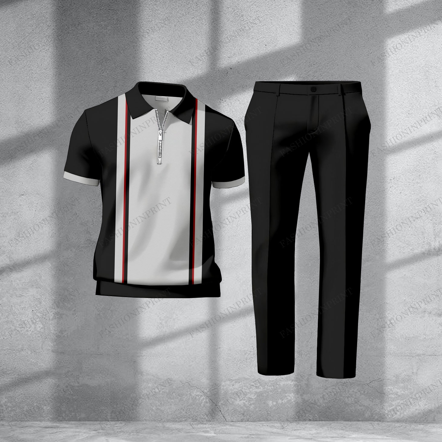 Men's Casual Black & Gray Color Matching Sriped Printed Short Sleeved Polo Shirt & Trousers Two-Piece Set