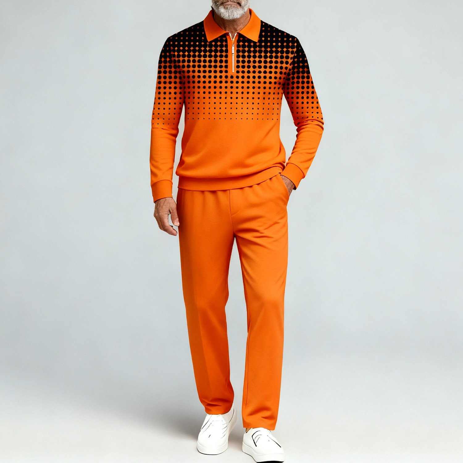 Men's Casual Black&Orange Polka Dots Color Matching Printed Polo-Collar Zipper Long Sleeved Trousers Two-Piece Set