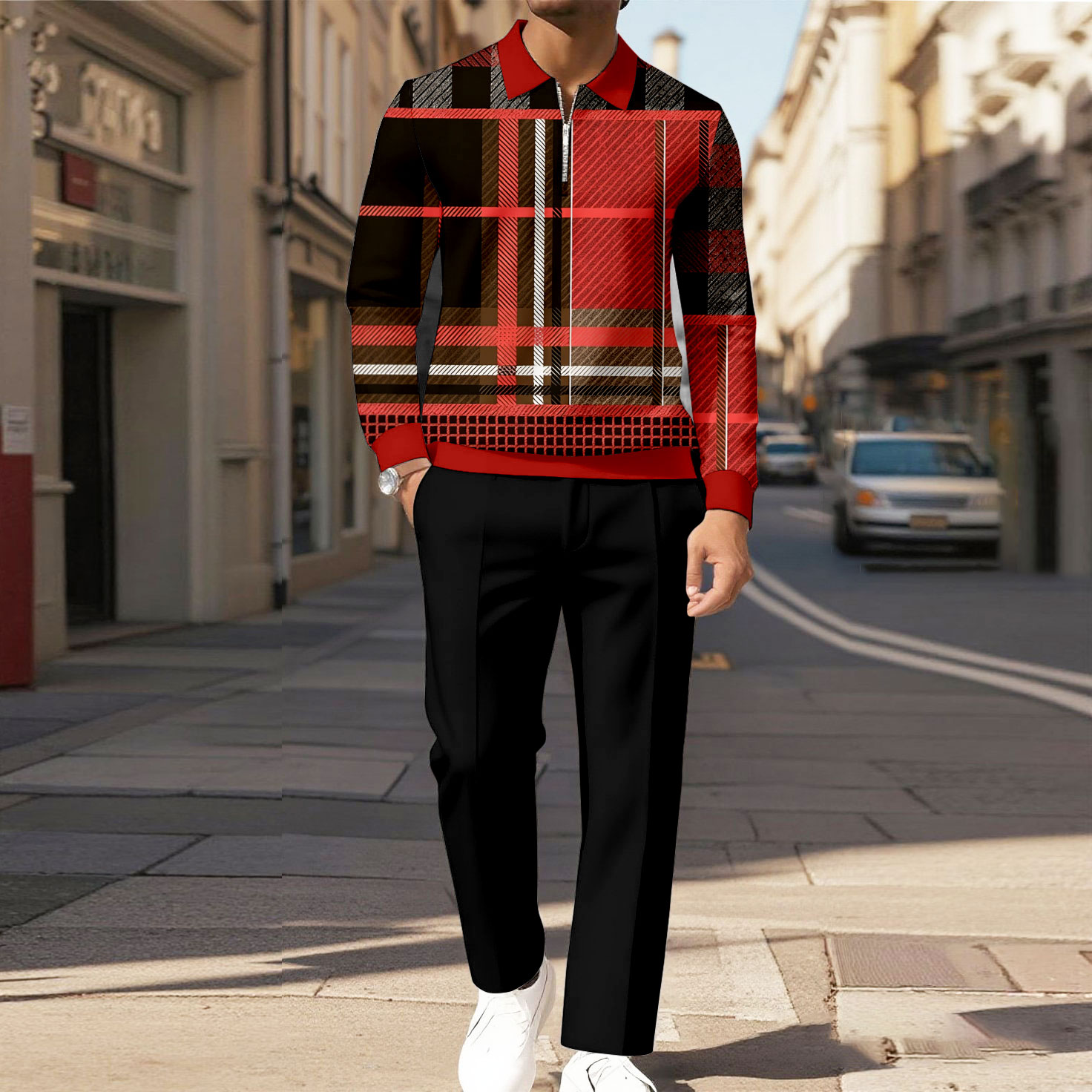 Men's Casual Black & Red Color Matching Geometric Printed Zipper Long Sleeved Polo Shirt & Trousers Two-Piece Set