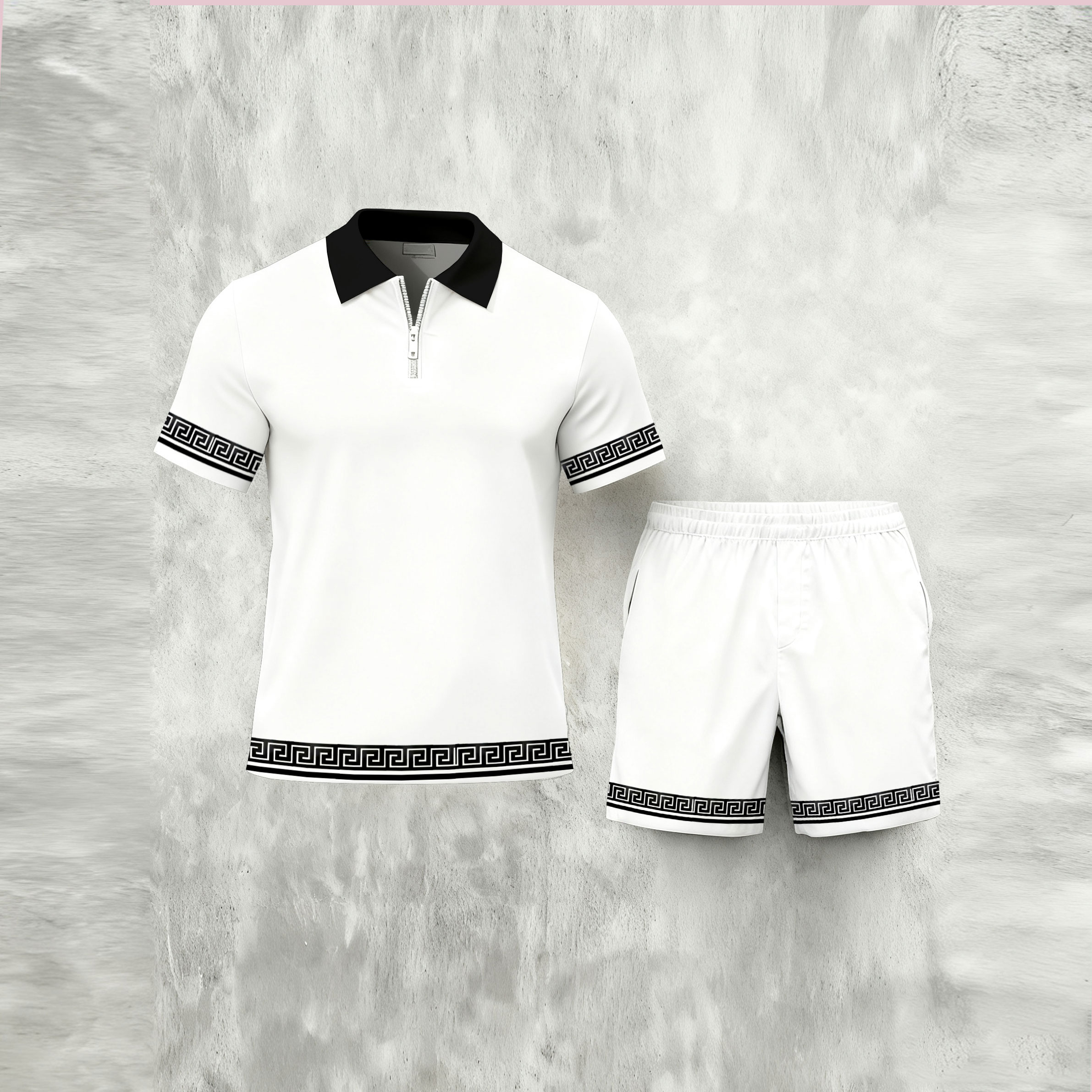 Men's Casual Black & White Color Matching Striped Print Short-Sleeve Zipper Polo Shirt & Shorts Two-Piece Set