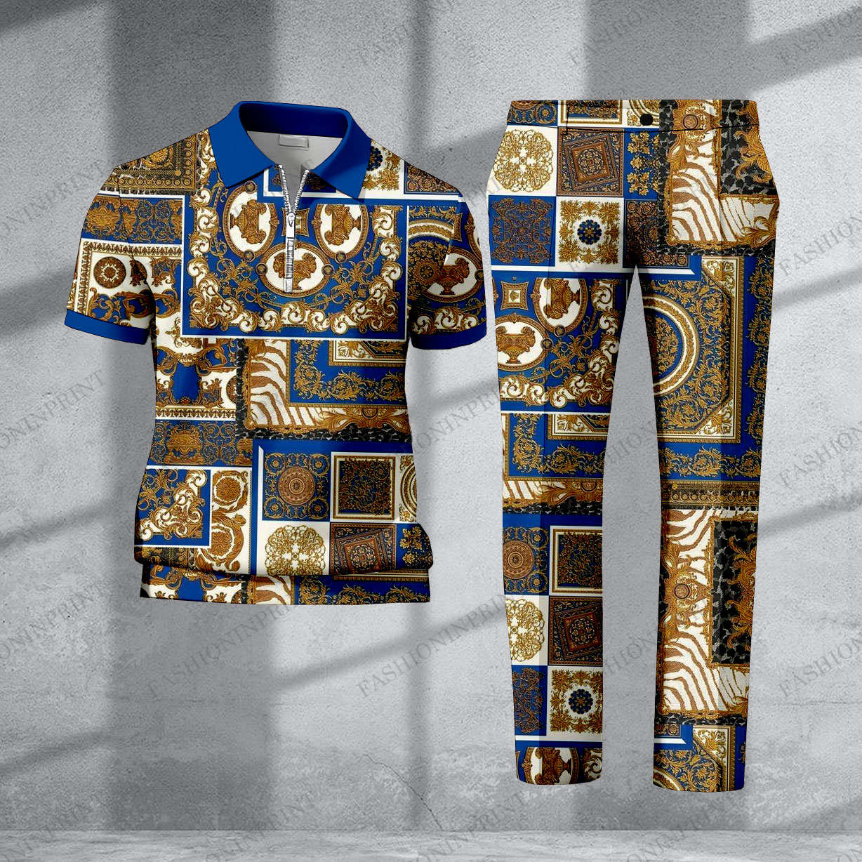 Men's Casual Blue & Gold Color Matching Baroque Style Printed Short Sleeved Polo Shirt & Trousers Two-Piece Set