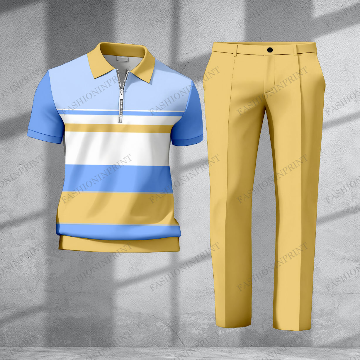Men's Casual Blue & Yellow Color Matching Striped Printed Short Sleeved Polo Shirt & Trousers Two-Piece Set
