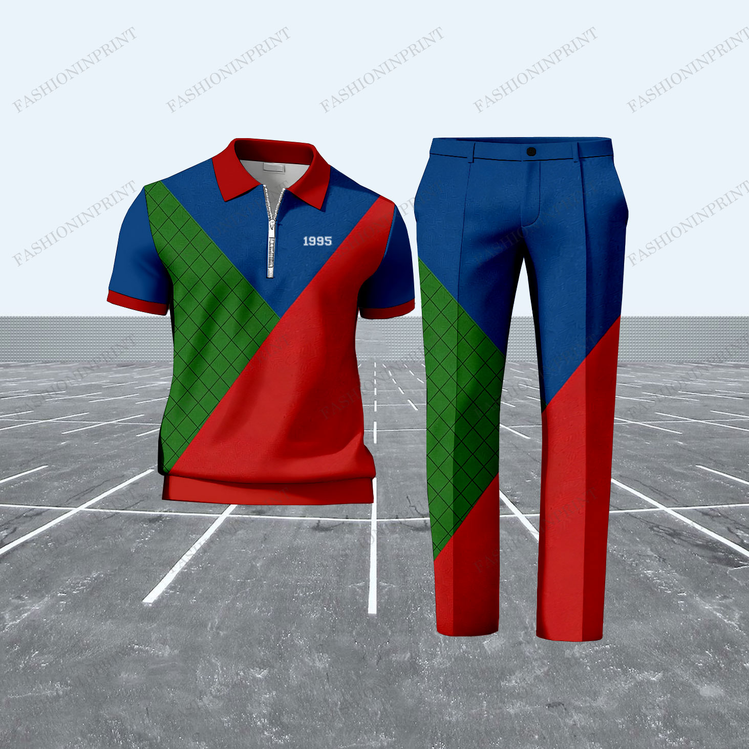 Men's Casual Bright Color Matching Geometric Printed Short Sleeved Polo Shirt & Trousers Two-Piece Set