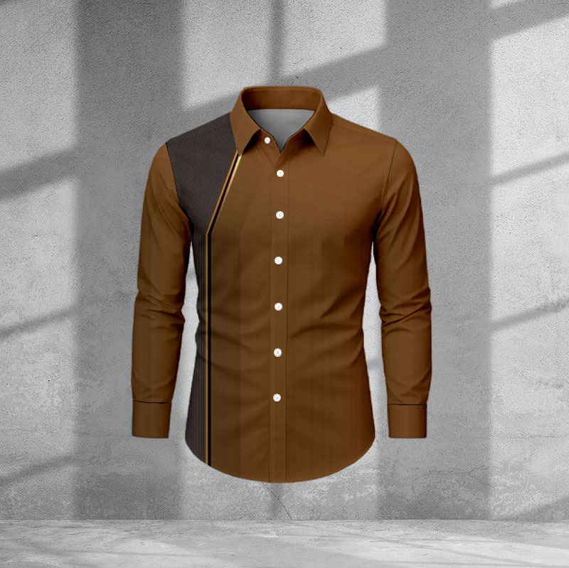 Men's Casual Brown & Coffee Color Matching Patchwork Asymmetric Print Long-Sleeve Shirt
