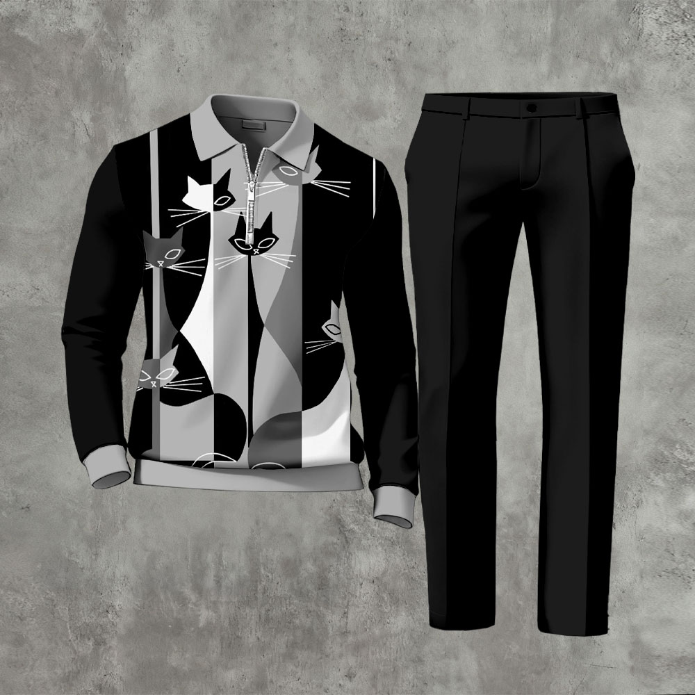 Men's Casual Cats Color Matching Printed Black & Gray Polo-Collar Zipper Long Sleeved Trousers Two-Piece Set
