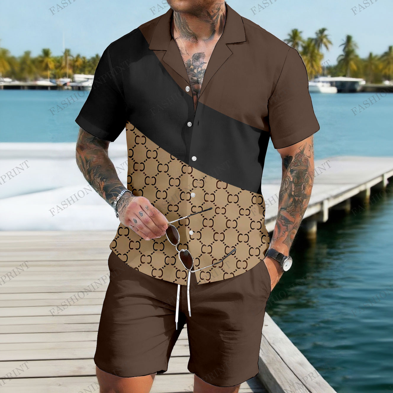 Men's Casual Coffee & Tan Color Matching Retro Style Print Short-Sleeve Shirt & Shorts Two-Piece Set