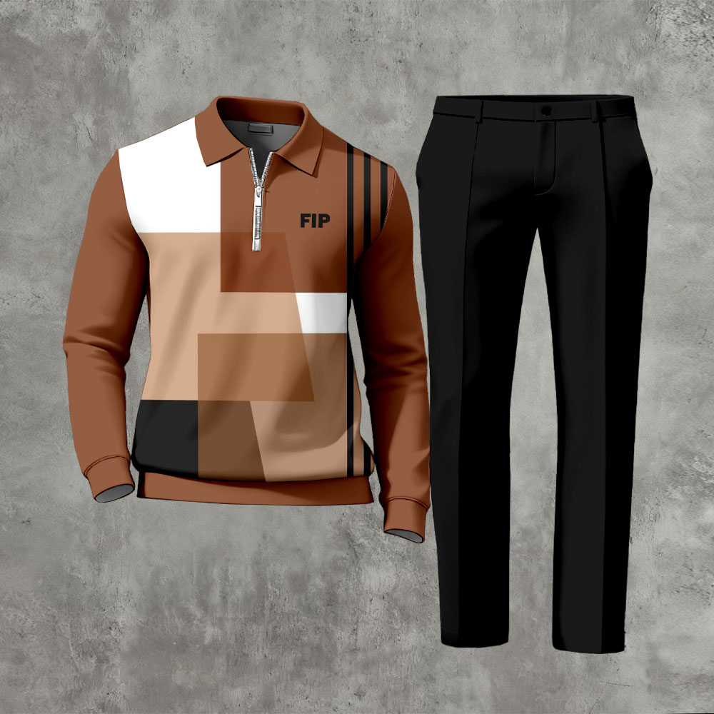 Men's Casual Color Brown & White Matching Geometric Printed Polo-Collar Zipper Long Sleeved Trousers Two-Piece Set