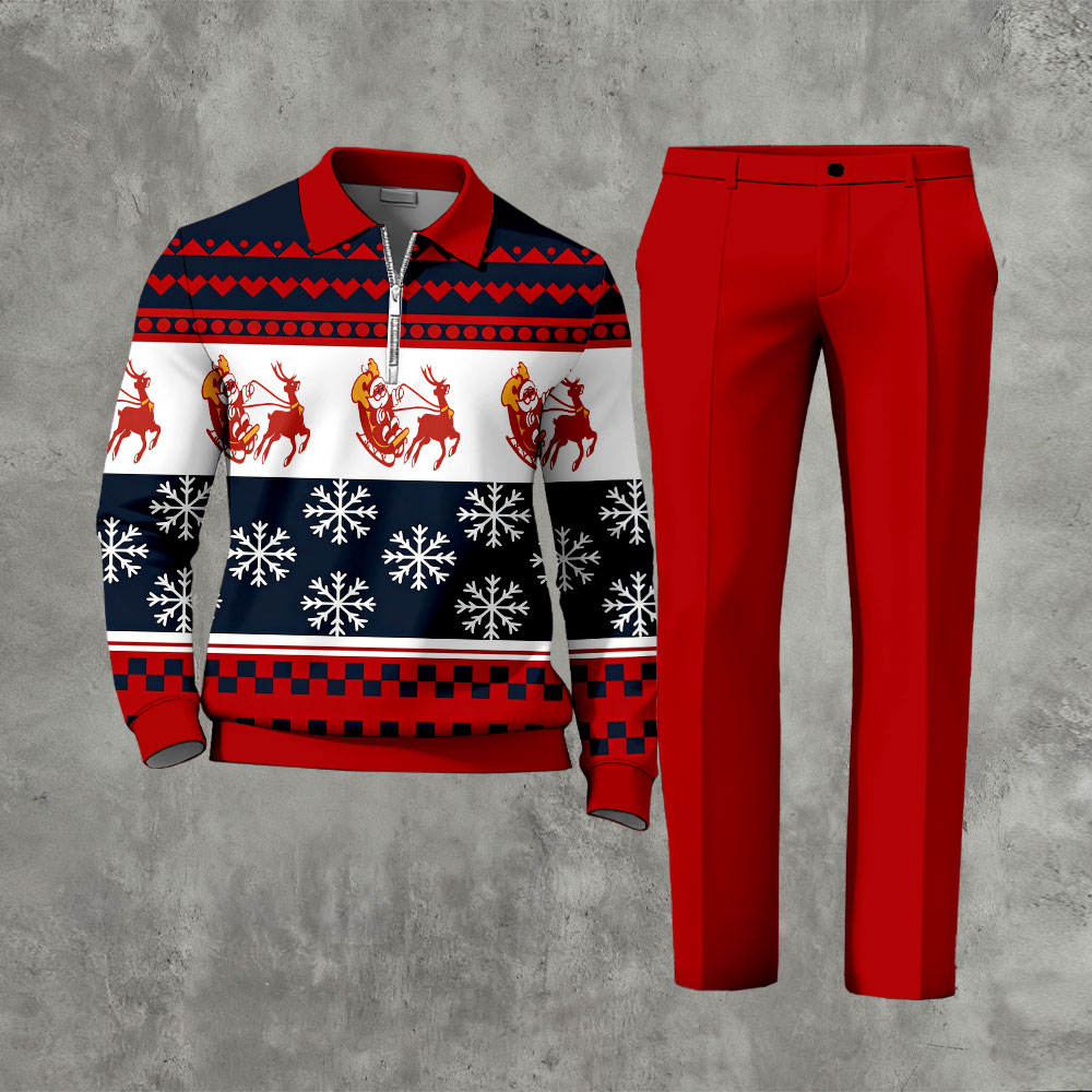 Men's Casual Red Navy And White Color Matching Christmas Printed Zipper Long Sleeved Polo Shirt & Trousers Two-Piece Set